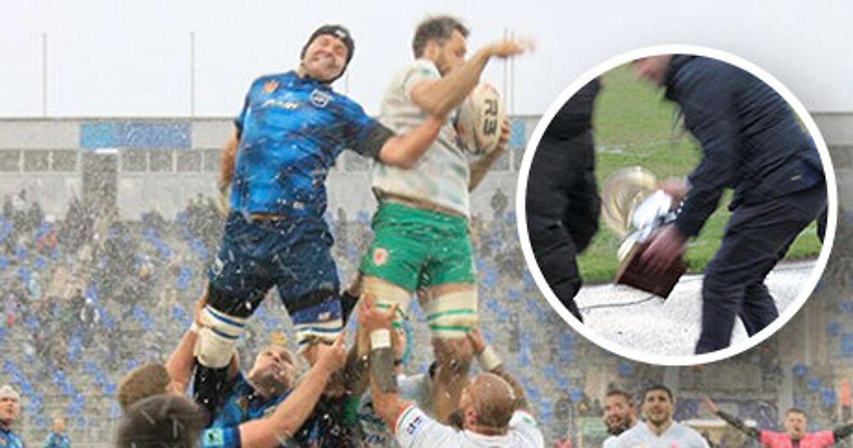 Все это время он стоял на постаменте у края поля, и то ли его плохо прикрепили, то ли порывы оказались слишком мощными, но трофей грохнулся и разлетелся на части.