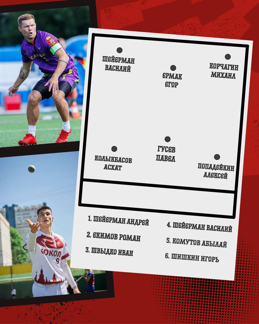 — Я бы разделил игроков на защитников и нападающих. В нападении — Шейерман Андрей, Екимов Роман («Омский Легион»), Швыдко Иван («Сокол»), Шейерман Василий («Омский Легион»), Комутов Абылай («Оренбуржье»), Шишкин Игорь («Гандикап 36»).
