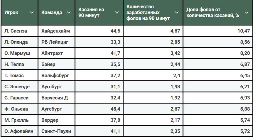 - Самая большая доля из всех выбита в Бундеслиге Сиензой - 10.47%