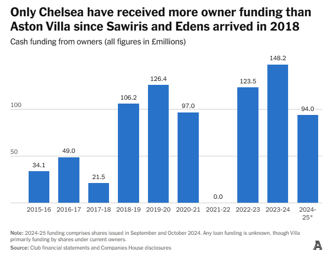 С момента прихода Нассефа Савириса и Уэса Эденса и до конца прошлого сезона «Вилла» получила от владельцев £601,3 миллиона наличными — почти все через выпуск новых акций. И если сумма кажется внушительной — так оно и есть. Среди английских клубов только «Челси» получил от акционеров больше за это время.