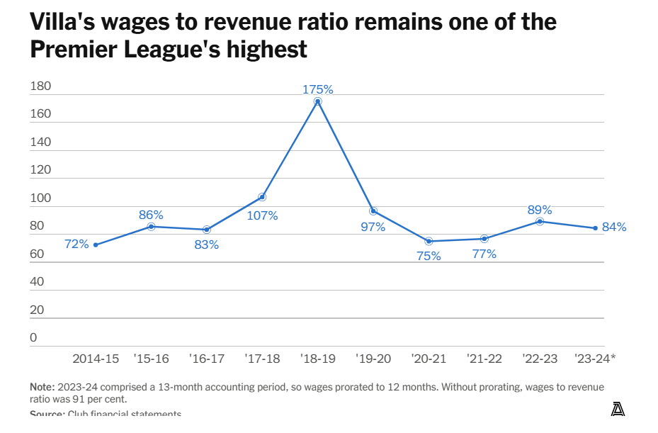 В прошлом сезоне соотношение зарплат к выручке «Виллы» составило 91% — высший показатель в лиге. Отчасти это объясняется удлиненным отчетным периодом, но даже после корректировки соотношение остается на уровне 84%. Лишь три клуба — «Ноттингем Форест», «Фулхэм» и «Борнмут» — тратили большую долю своих доходов на персонал в сезоне-2023/24.