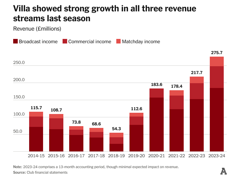 Как мы уже видели, убыток «Виллы» в прошлом сезоне действительно сократился — хотя и благодаря спешной продаже Дугласа Луиса в последний момент. При этом второй год подряд клуб отчитался о рекордной выручке: доходы достигли £275,7 миллиона. И в 2024/25 году ожидается третья подряд рекордная вершина — благодаря затяжному походу по Лиге чемпионов.