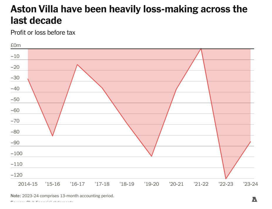 С тех пор как Нассеф Савирис и Уэс Эденс приобрели клуб в начале сезона 2018/19, «Вилла» накопила совокупные убытки до налогообложения в размере £411,4 миллиона. За это время больше среди английских клубов терял только «Эвертон» (£553,3 миллиона) — и то, наверное, с особым упорством.