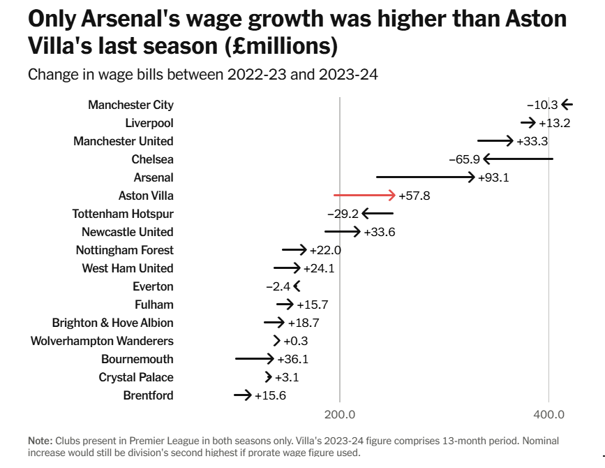 И даже с учетом этих бонусов и растянутого отчетного периода зарплатная ведомость «Виллы» была лишь шестой по величине в Премьер-лиге. Так что финиш на четвертом месте под руководством Унаи Эмери можно считать своего рода маленьким чудом — или, по крайней мере, значительным перевыполнением плана. Эмери сломал старую тенденцию менеджеров «Виллы» в высшем дивизионе: при нем клуб каждый сезон финишировал выше, чем диктовал размер зарплатной ведомости (в сезоне-2022/23 они заняли седьмое место при восьмом бюджете на зарплаты).
