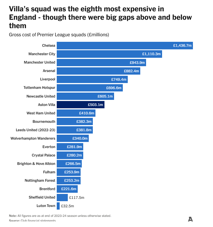 На конец июня 2024 года стоимость состава «Ньюкасла» была более чем на £100 миллионов выше, чем у «Виллы» — хотя еще до октябрьского поглощения в 2021 году разрыв был в пользу бирмингемцев (£38,3 миллиона). В этом сезоне «Вилла» слегка сократила отставание, отчасти потому что «Ньюкасл» почти не шевелился на трансферном рынке в 2024/25. Но само по себе это сравнение остается показательным.