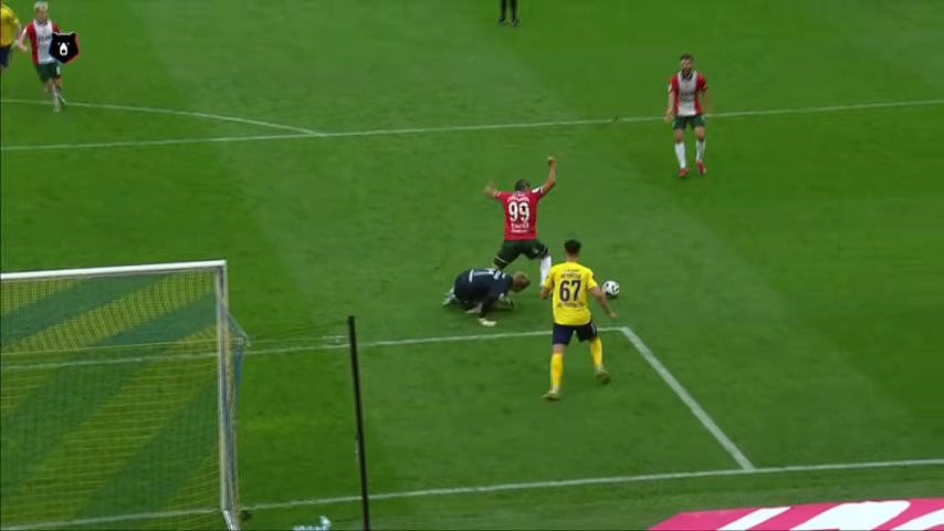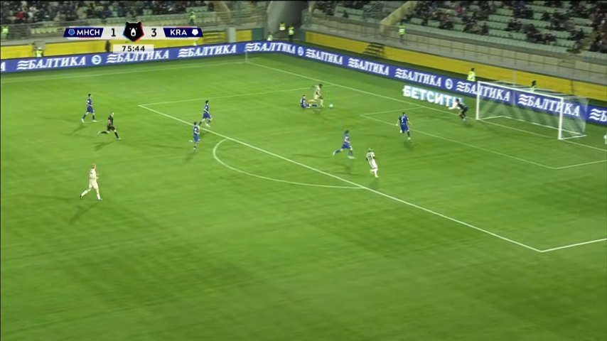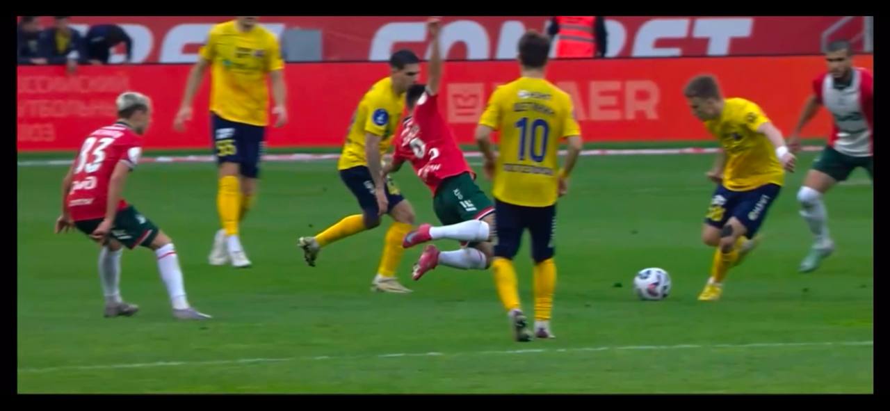 Здесь мало того, что Карасев мог остановить игру после первого контакта (по Правилам фиксация мяча вратарем наступает после остановки мяча между рукой и полем), он не наказал за просовывание Сулеймановым ноги через руки в сторону корпуса вратаря - за это игрока еще можно оправдать если он контролирует мяч, а во всем эпизоде Сулейманов вообще мяча не коснулся ни разу. А потом игрок Локо еще и симулирует фол, взмахивая руками. Это - простой прием, чтобы упасть на землю не пытаясь освободиться от соперника, а смещая центр тяжести вниз за счет рук, просто согнуть колени и достаточно правдиво упасть. То же самое очень любит делать Мирзов - в обзоре 1 тура этот трюк разобран детально. Поэтому в данной ситуации самое верное, если ты не остановил игру после первого контакта вратаря с мячом, продолжить игру. Деградация Карасева по ходу сезона продолжается, он начал менять мнение уже по советам ВАР Буланова и Галимова: еще полгода назад такого представить было нельзя. По ожидаемым голам xG 1,55-1,10, по голевым шансам BigChance 6-2, по ожидаемым очкам xPTS 1,67 - 1,03, что укладывается в итоговые 1:1.