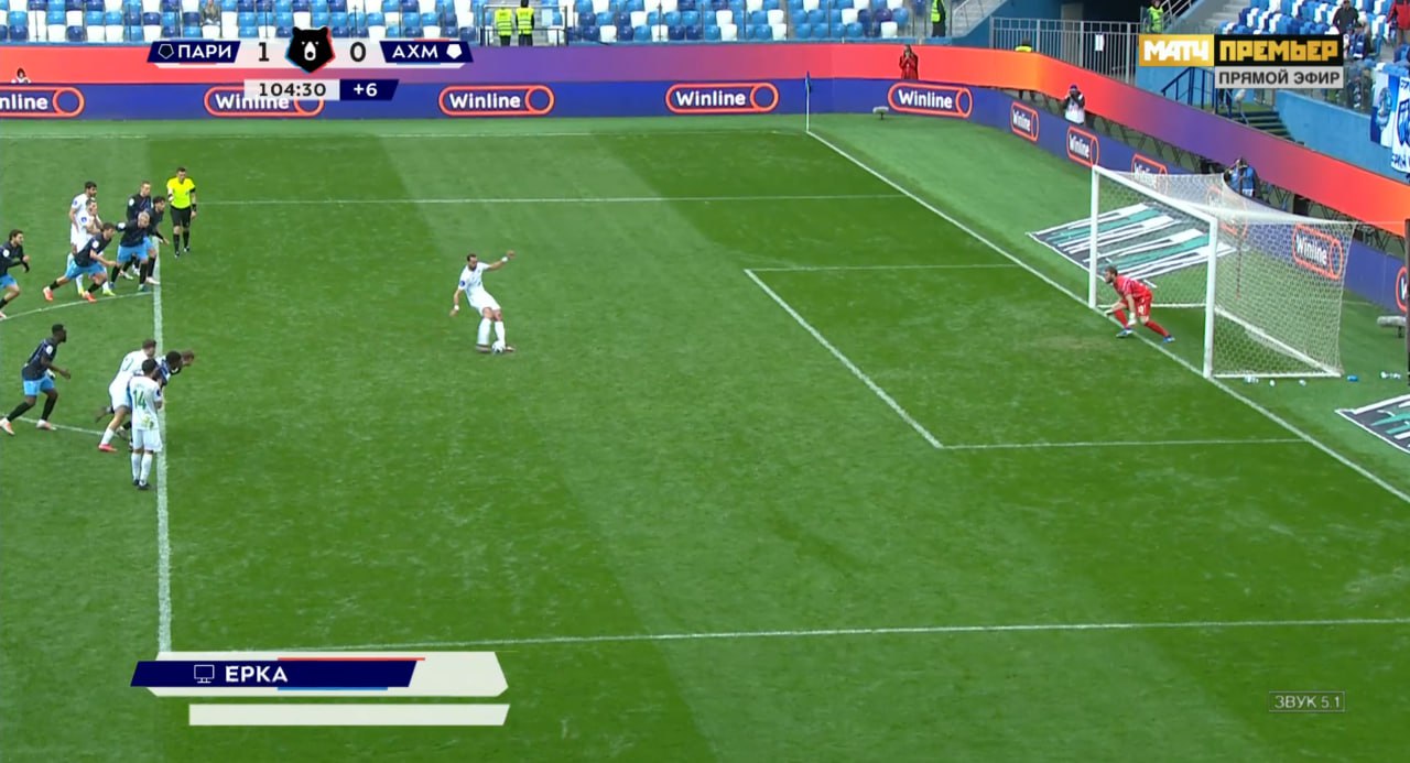 который закончился КК для основного игрока сборной России Дивеева. Во втором тайме игра совсем не поменялась - Ахмат вроде был с мячом, пытался атаковать, но ничего реального не создал. Кроме гола Самородова из «вне игры», который определил АВАР Федоров. А Пари НН мог забивать дважды: сначала Грулев, как обычно, не попал в ворота на 68 минуте, а удар Карапузова на 80 заблокировали защитники. Ну а потом начался форменный цирк: сначала Кукуян нашел какое-то касание мяча с рукой Гоцука