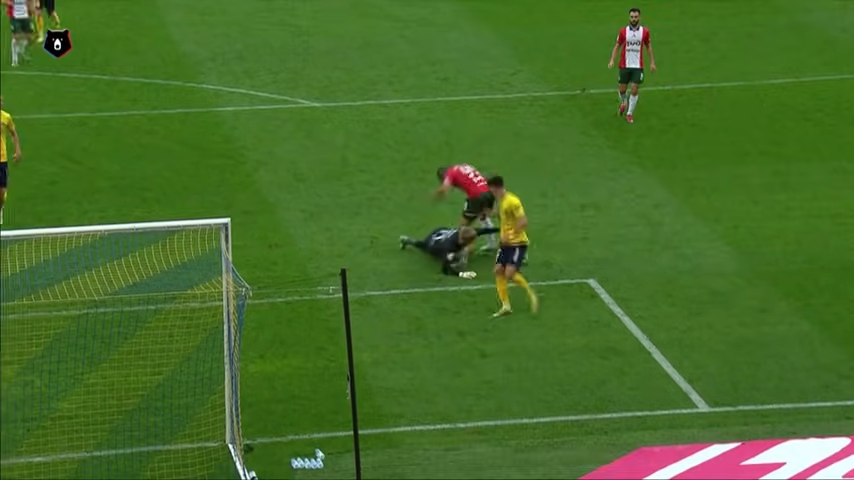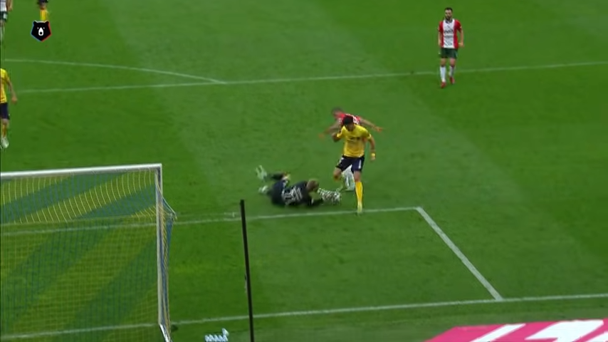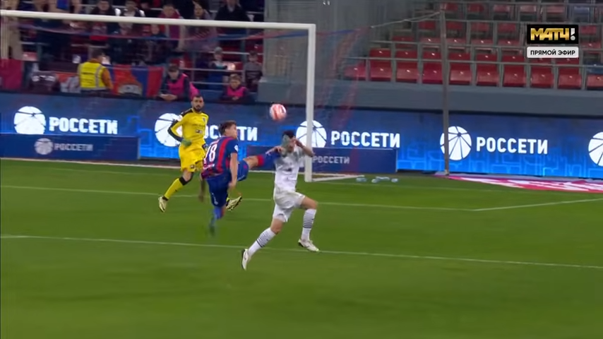 Если здесь игрок Акрона, уже поставивший ногу на землю совершил фол, то что тогда сделал Маркиньос, задевающий ногу Койта в движении? По Правилам такая игра Маркиньоса больше похожа на нарушение. Следующий момент - «придуманное нарушение» при первом голе ЦСКА