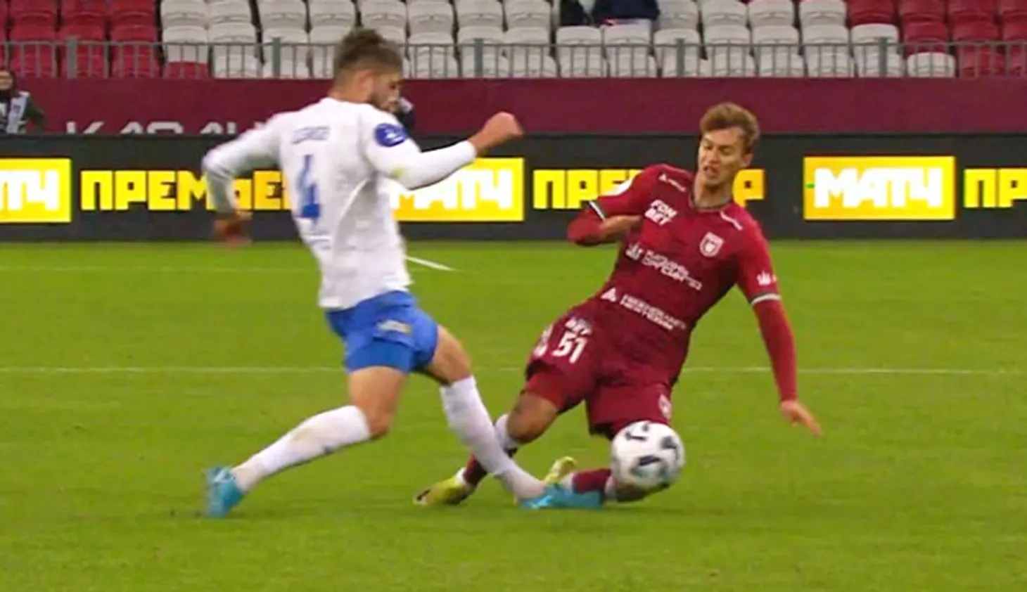 но по «устоявшейся традиции» дисциплинарных санкций от Карасева не получил. Никаких. Зато получил их Ростов за необычный контакт вратаря Одоевского с Сулеймановым, который мы проиллюстрируем сразу 3 скринами, иначе разбор будет непонятен. Сначала - контакт с мячом рук вратаря: