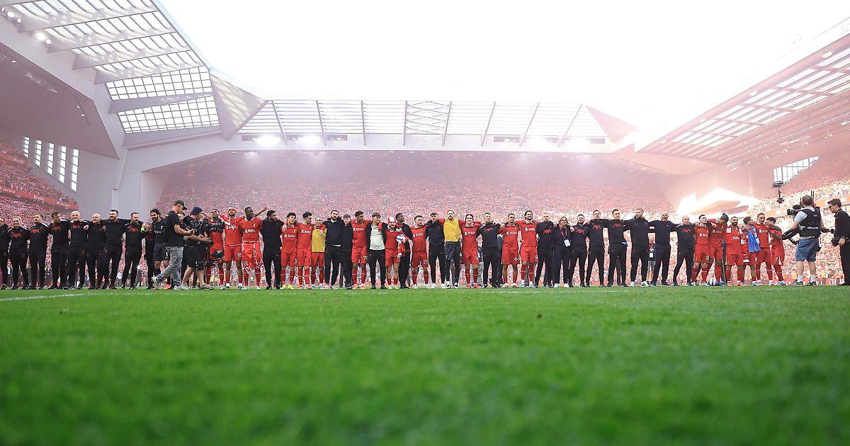 Родные ли мне эти лица? Арне Слот, тренирующий команду первый сезон. Коди Гакпо, снявший футболку после забитого гола и запустивший отсылку к Кака майкой с надписью «I Belong To Jesus». Алексис Макаллистер, красавчик, который не подпевает. Трент Александр-Арнольд, воспитанник, мечтавший отыграть всю карьеру в «Ливерпуле», который уходит в «Реал» бесплатно: не понятно, счастлив он чемпионству или тому, что скоро познакомится с эскортницей Джуда?