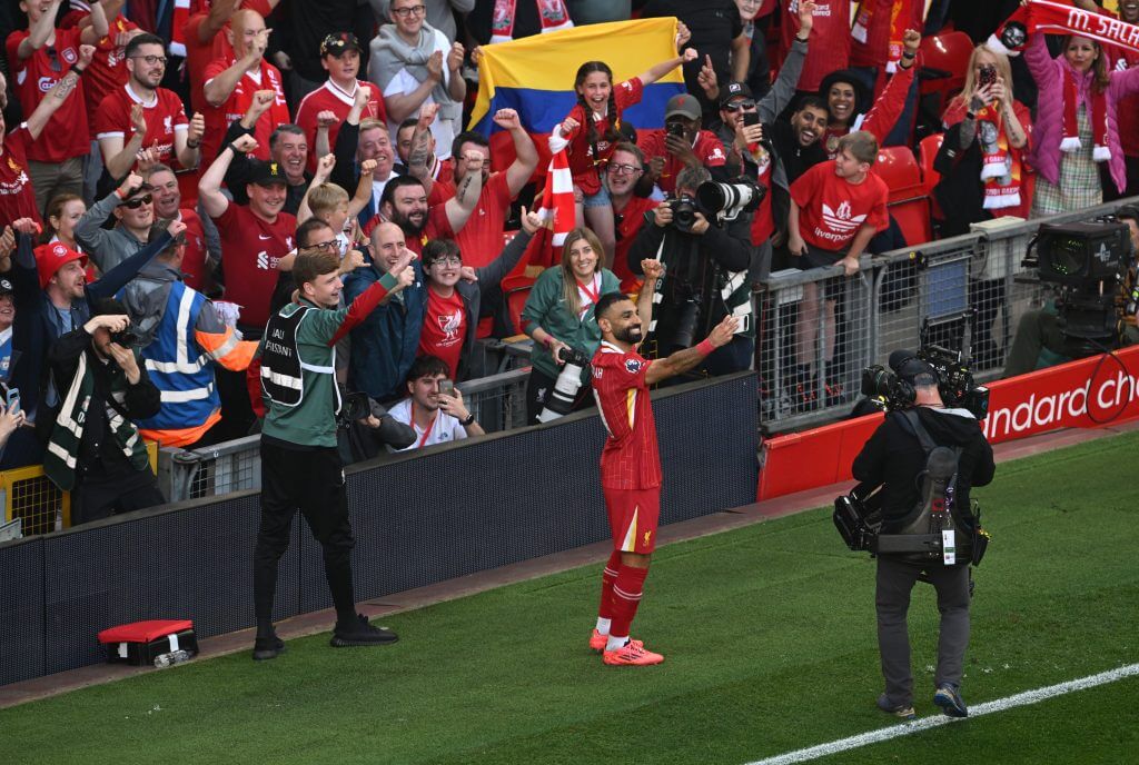 Стоя с вытянутой рукой перед «Энфилдом», египтянин щелкал телефоном, протянутым ему во время празднования гола.