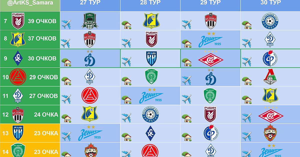 «Крылья» сейчас на 9-м месте, и вроде бы заветная восьмерка совсем рядом, вот только отрыв от неё составляет внушительные 7 очков. Учитывая, что до конца чемпионата осталось лишь 4 тура... чтобы занять 8-е место, нужно 100% выигрывать свои матчи, набирать 12 очков в оставшихся 4 играх и надеяться на то, что все наши конкуренты будут терять очки...