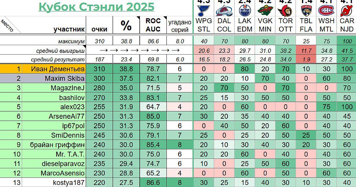 Однако на дистанции турнира показатели ещё должны скорректироваться вниз, нивелируя случайный успех. На это указывает средняя точность прогнозов чемпиона 2024 г. — всего 30,33% (а в Кубке Гагарина сейчас — 31,7%).