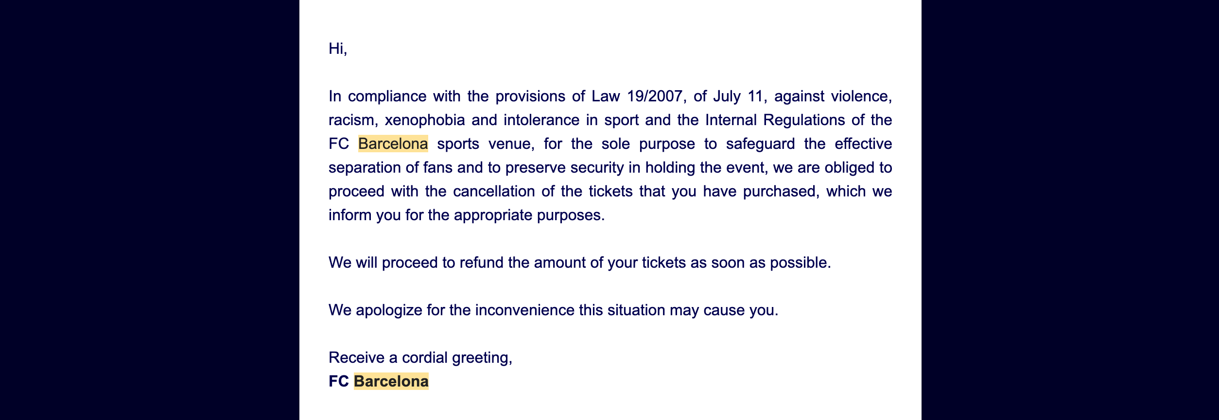 В соответствии с положениями Закона 19/2007 от 11 июля, направленного против насилия, расизма, ксенофобии и нетерпимости в спорте, а также в соответствии с внутренними правилами спортивного комплекса ФК «Барселона», и исключительно с целью обеспечения эффективного разделения болельщиков и сохранения безопасности при проведении мероприятия, мы вынуждены аннулировать приобретенные вами билеты. Настоящим информируем вас об этом для принятия к сведению.