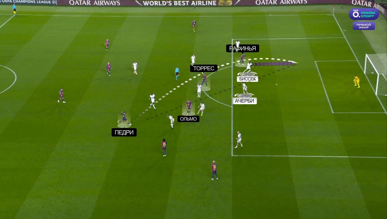 Например, Ферран очень редко вообще заполнял позицию центрфорварда в позиционных атаках «Барсы». Часто мы могли наблюдать ситуацию, когда Рафинья и Ольмо располагаются выше и активнее атакуют штрафную соперника. Рассмотрим эпизод, который привел к первому удару Торреса по воротам – мяч идет на Ямаля, а Рафинья и Ольмо располагаются выше Феррана: