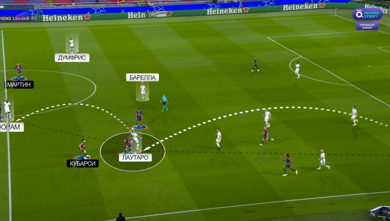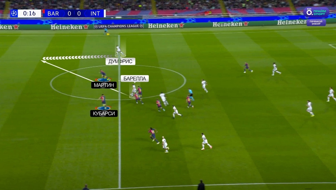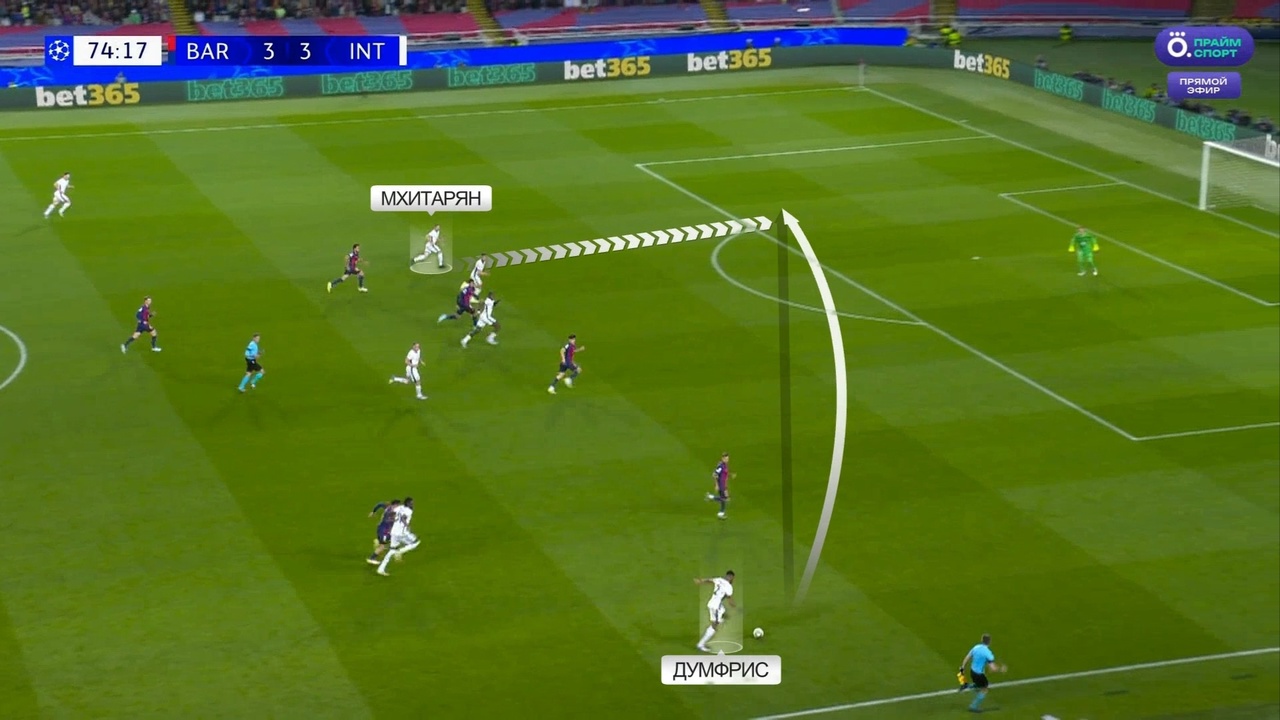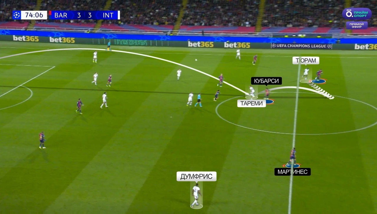 Именно с выбивания Зоммера на Тареми началась атака с отмененным голом Мхитаряна. Все по одному и тому же паттерну: «Интер» цепляется за мяч, находит Думфриса и дальше он обостряет либо за счет передачи, либо за счет скоростного забега. В данном случае «Барсу» спасли сантиметры от четвертого пропущенного: