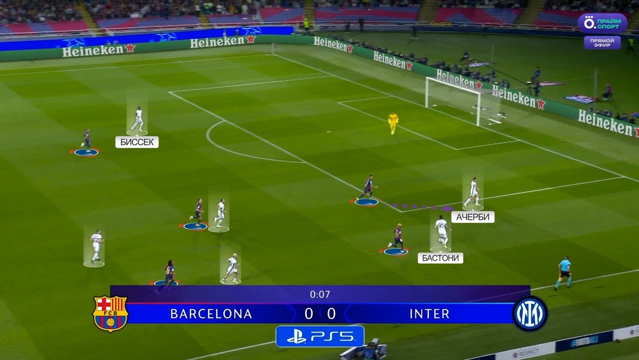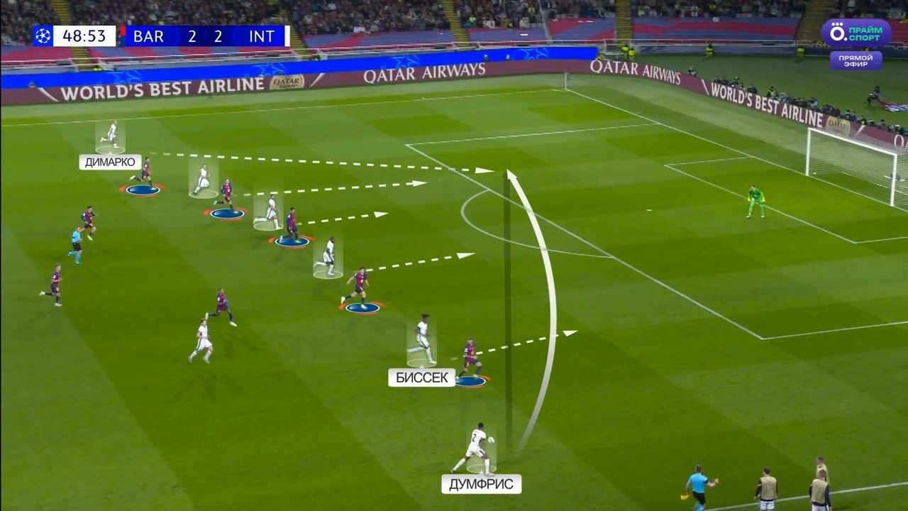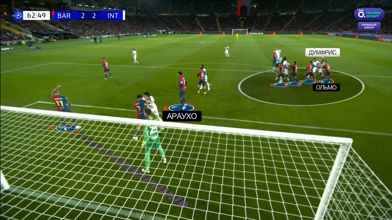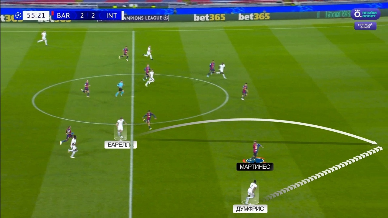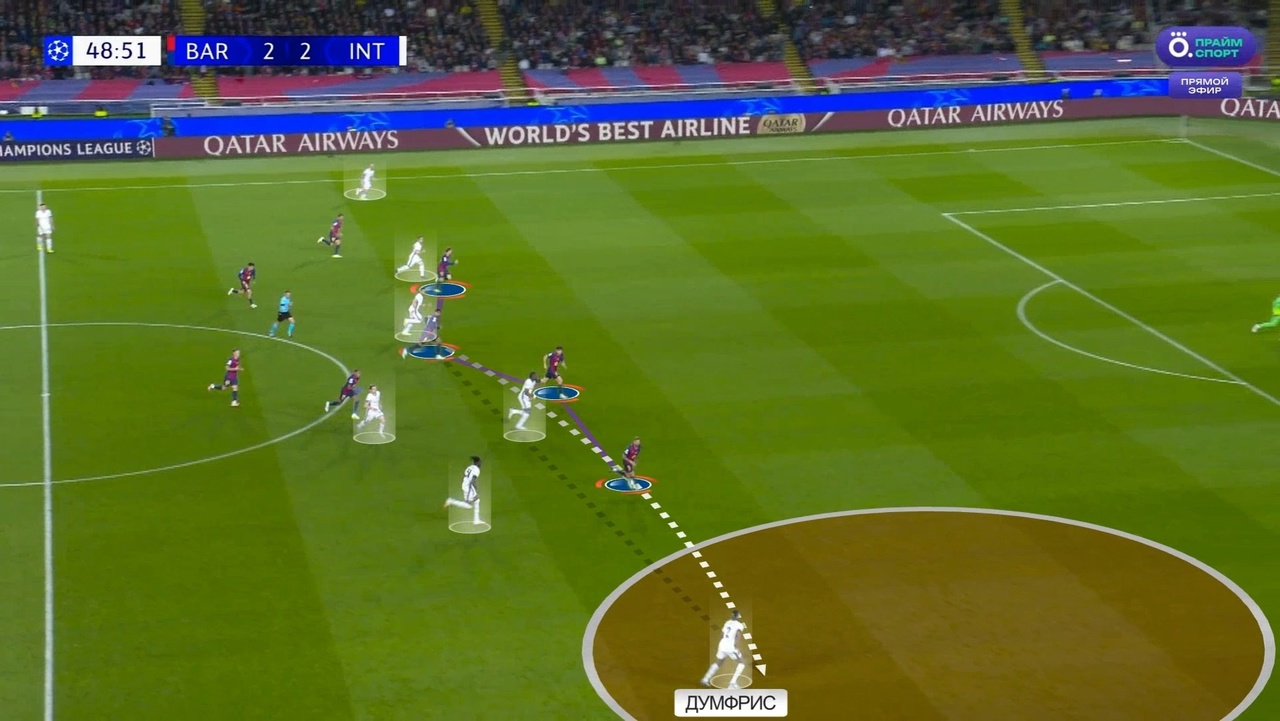 Именно с выбивания Зоммера на Тареми началась атака с отмененным голом Мхитаряна. Все по одному и тому же паттерну: «Интер» цепляется за мяч, находит Думфриса и дальше он обостряет либо за счет передачи, либо за счет скоростного забега. В данном случае «Барсу» спасли сантиметры от четвертого пропущенного: