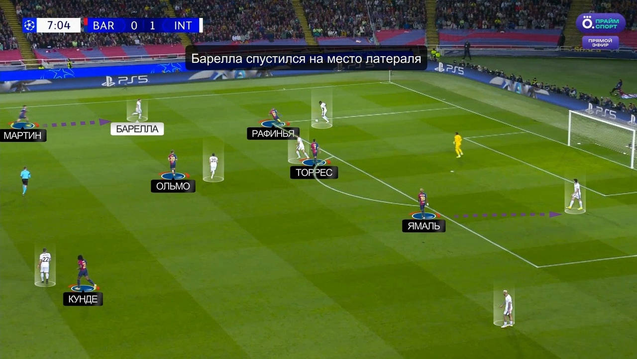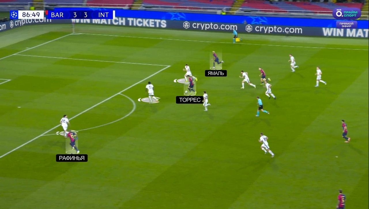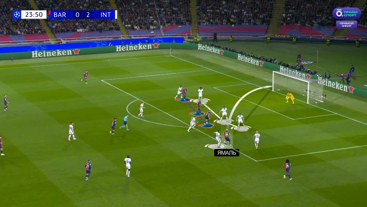 В этом проходе также стоит отметить косвенную роль Рафиньи, Торреса и Ольмо – они заставили своим движением играть осторожнее трех ЦЗ «Интера». Именно поэтому Бастони не выдвинулся встречать Ямаля, из-за чего тот получил секунды, чтобы нанести свой шальной удар.