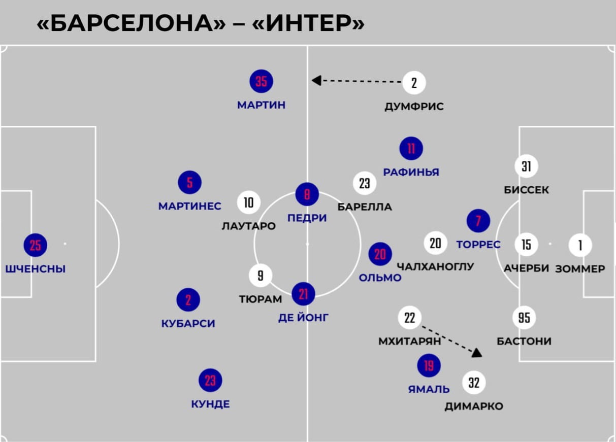 «Интер» провел весьма слабый матч с точки зрения сдерживания «Барсы» – Ямаль наплевал на все слои подстраховок против него, а Торрес, Ольмо и Рафинья кошмарили защитников «нераздзурри». Однако при игре с мячом команда Индзаги очень показательно вскрыла недостатки «Барсы». В первом тайме наказали за смелый прессинг при отсутствии Бальде. Во втором тайме манипулировали давлением каталонцев, благодаря чему смотрелись даже острее на этом отрезке.