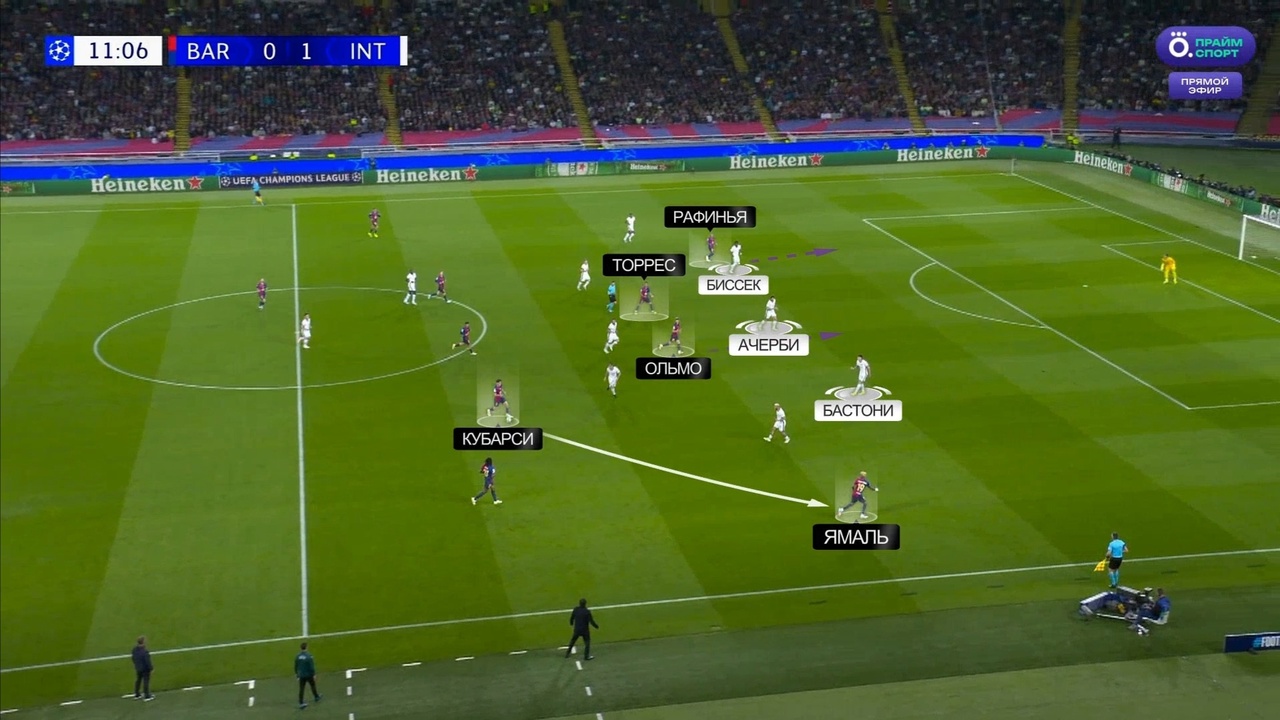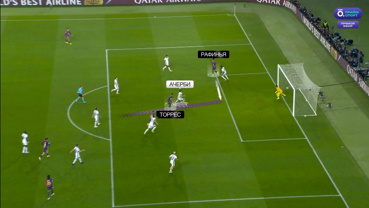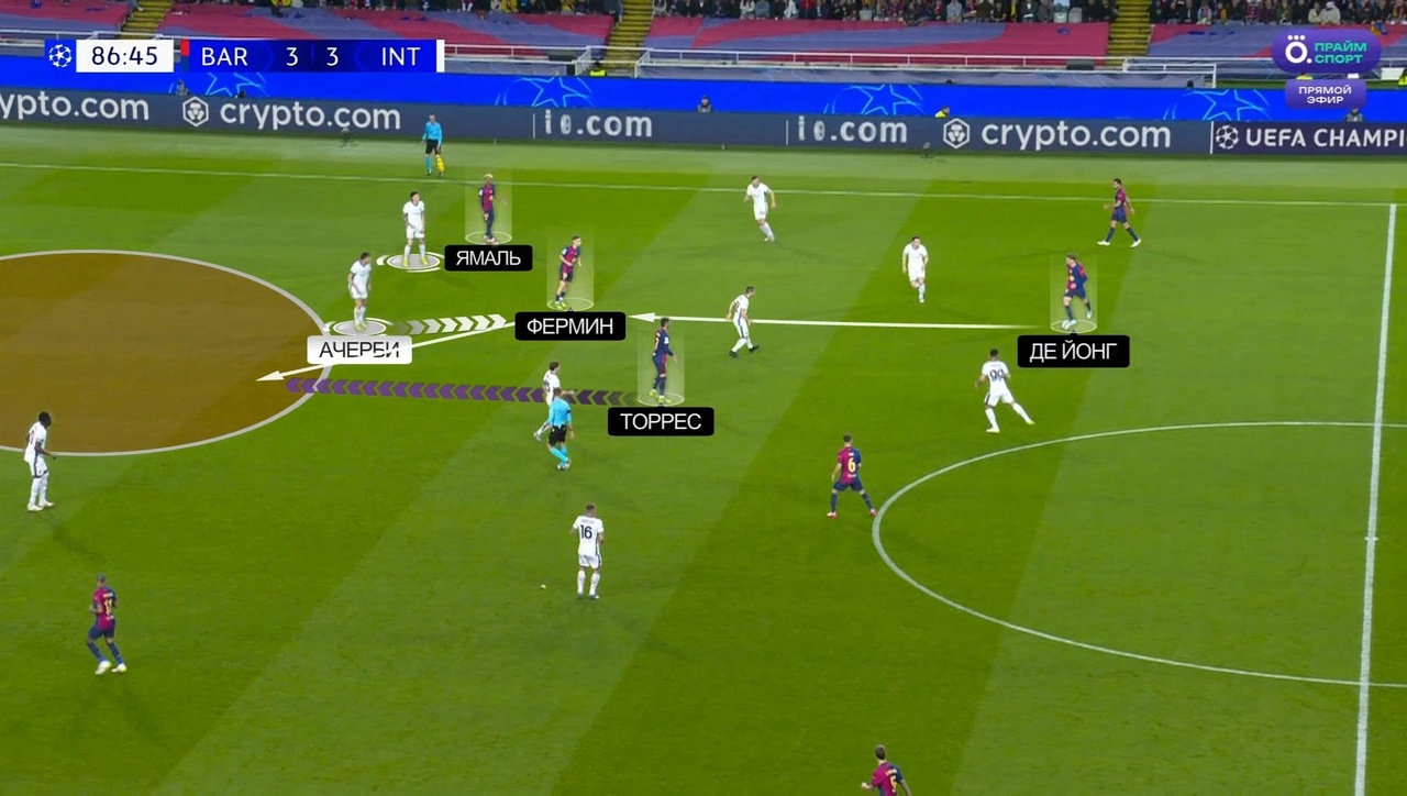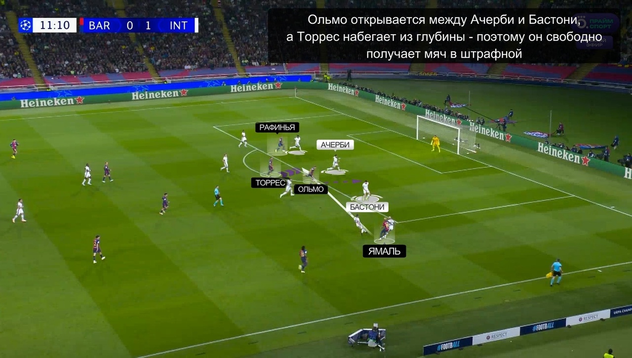 Благодаря своей изначально глубокой позиции, Ферран уже с начала эпизода избавился от опеки. Перед тем, как на него последовал пас от Ямаля, Ольмо грамотно открылся в пространство между Бастони и Ачерби, что гарантировало Торресу лишние секунды свободы внутри штрафной:
