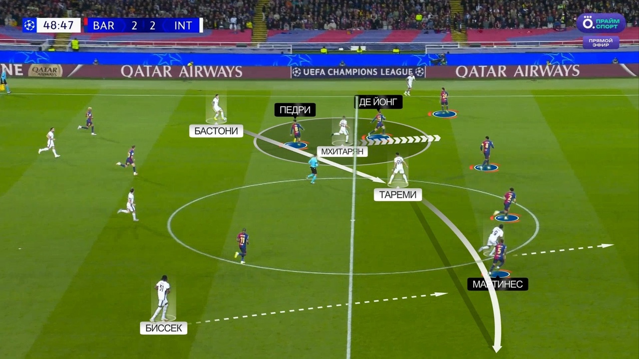 Генрих Мхитарян делает резкий рывок вперед – на нем в этом эпизоде и де Йонг, и Педри, потому они устремляются за Генрихом, открывая таким образом линию передачи Бастони на Тареми, который потом переведет мяч на Думфриса:
