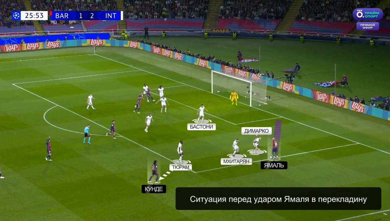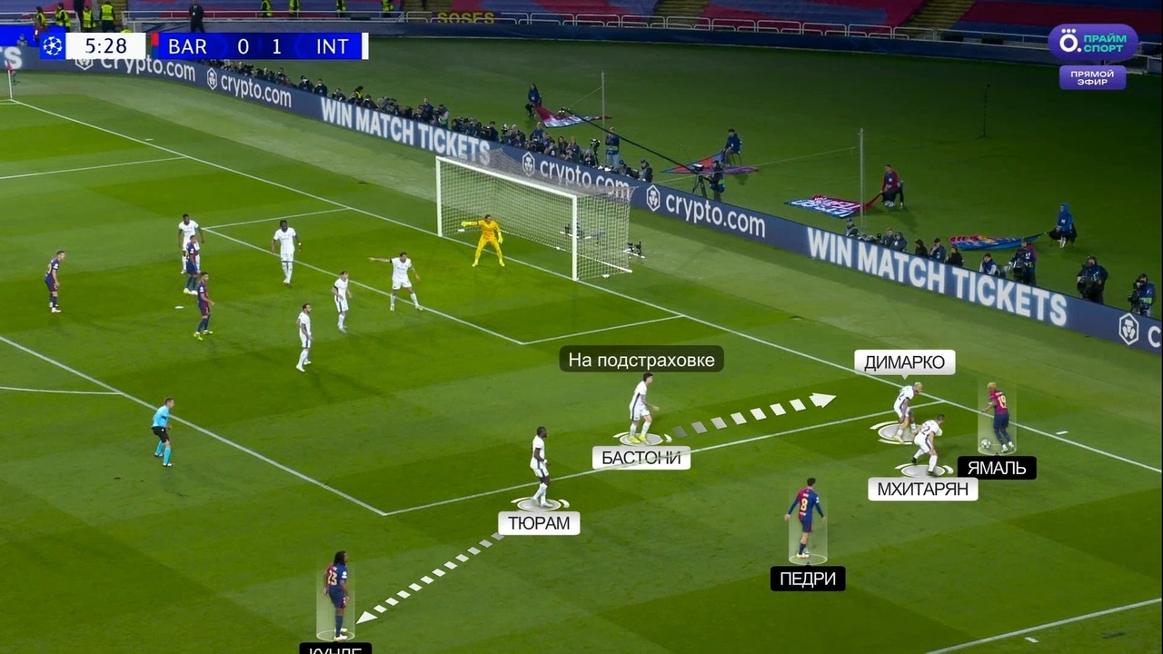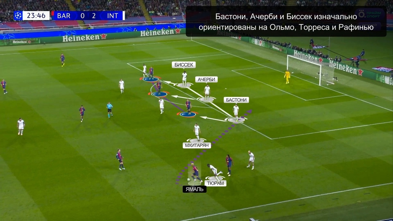 Против Ламина «Интер» действительно специально подготовился. Во-первых, «нерадзурри» не позволяли себе допускать ситуаций, когда Ямаль получает мяч 1-в-1 с защитником – для этого Генрих Мхитарян шел помогать Федерико Димарко. Во-вторых, на подстраховке у этих двоих был Алессандро Бастони. Помимо всего прочего, еще и Маркус Тюрам активно помогал в обороне на этом фланге. Таким образом Индзаги подготовил против Ямаля целую оборонительную систему с подстраховками чуть ли не под каждый возможный сценарий: