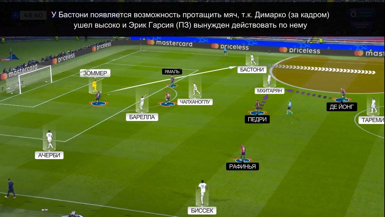 Рассмотрим несколько примеров. Очередной розыгрыш от ворот Зоммера: Ачерби и Бастони расходятся максимально широко – Ямаль не перекрывает линию паса Зоммера на Бастони, поэтому Зоммер пасует именно на него. У Алессандро есть возможность продвинуться с мячом – Димарко поднялся высоко, заставив Эрика Гарсию играть по нему, поэтому Бастони никто не встречает: