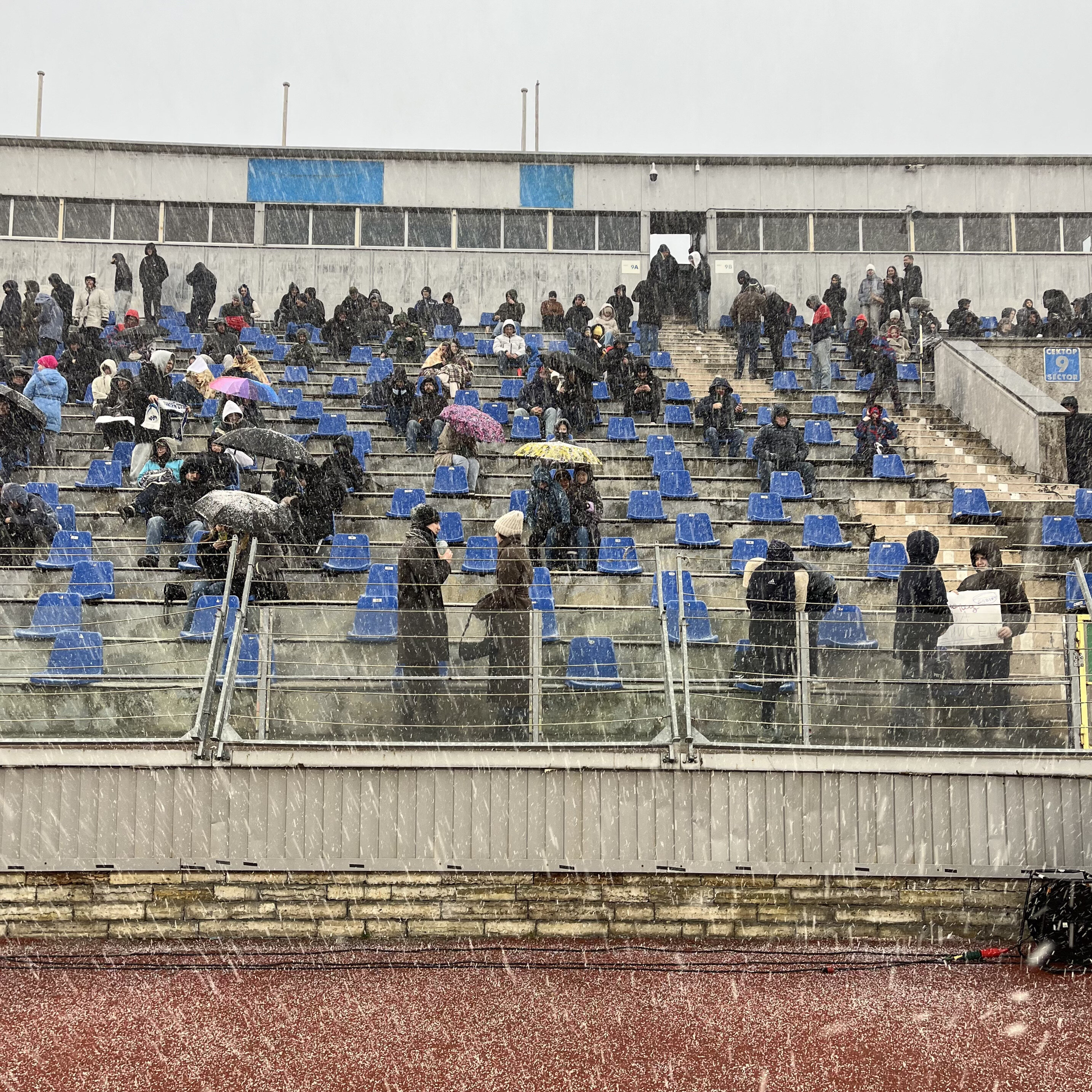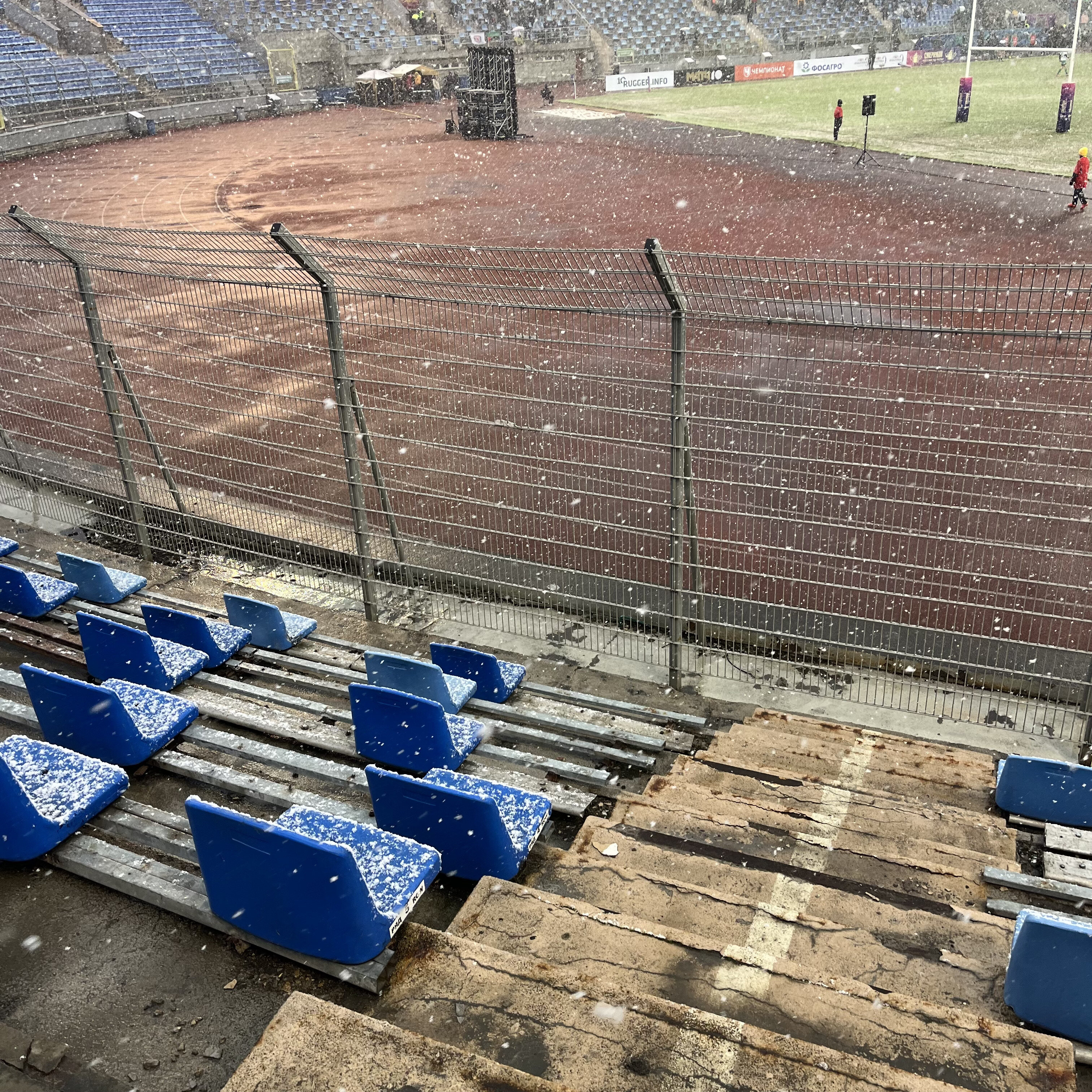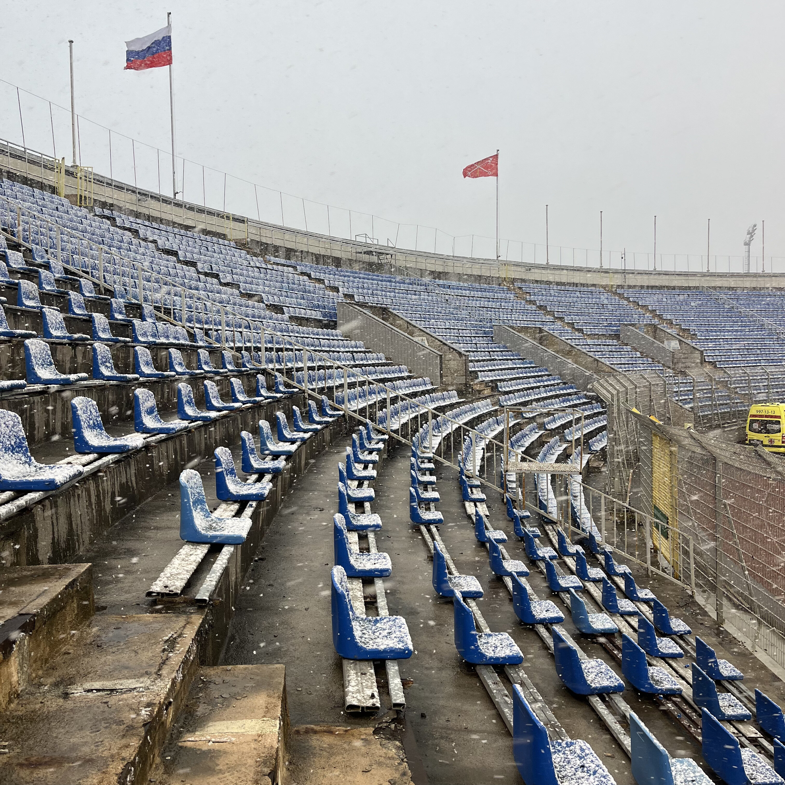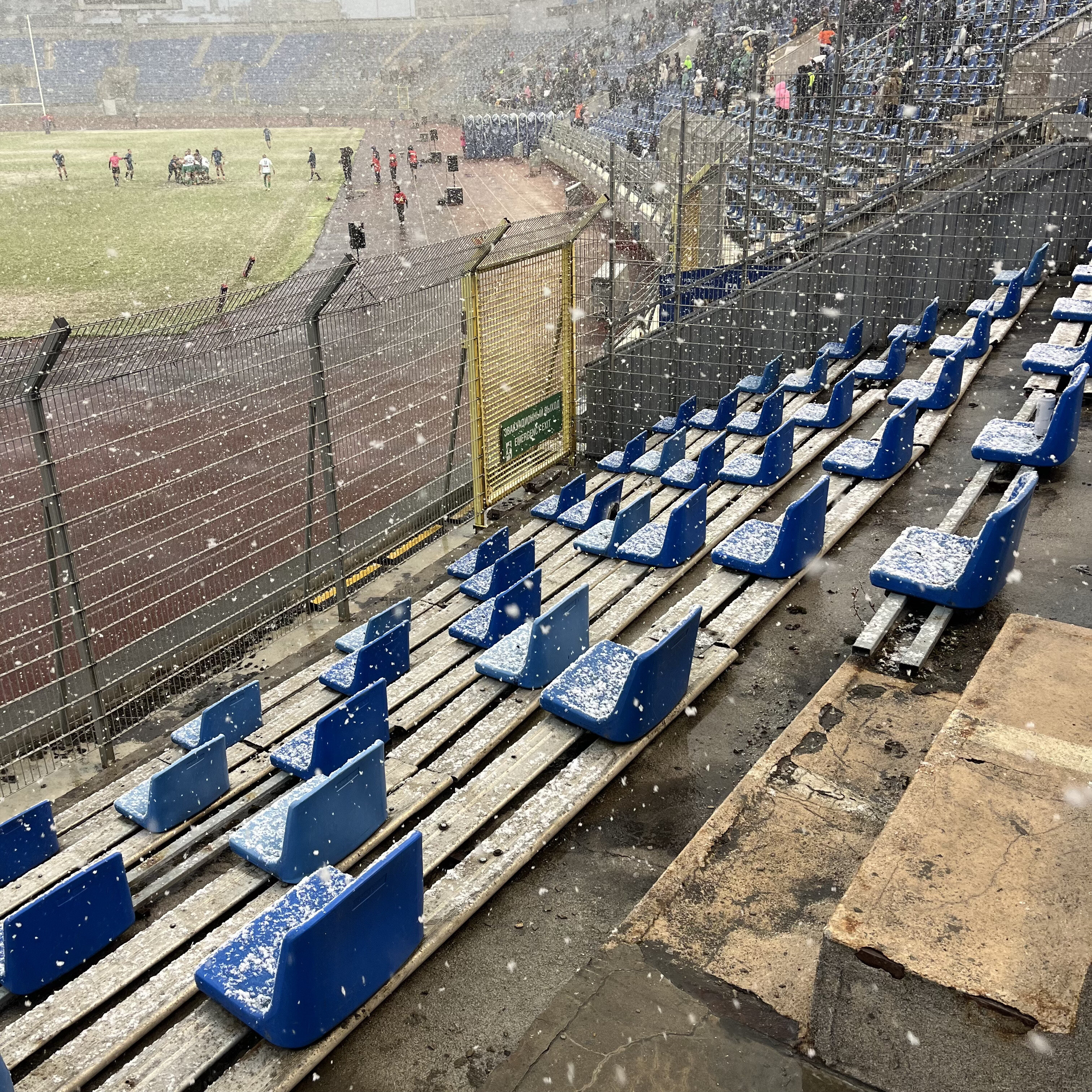 Поднимаюсь на пустовавший в тот день одиннадцатый сектор. Снег как раз усилился – вот как трибуна выглядит в таком антураже.