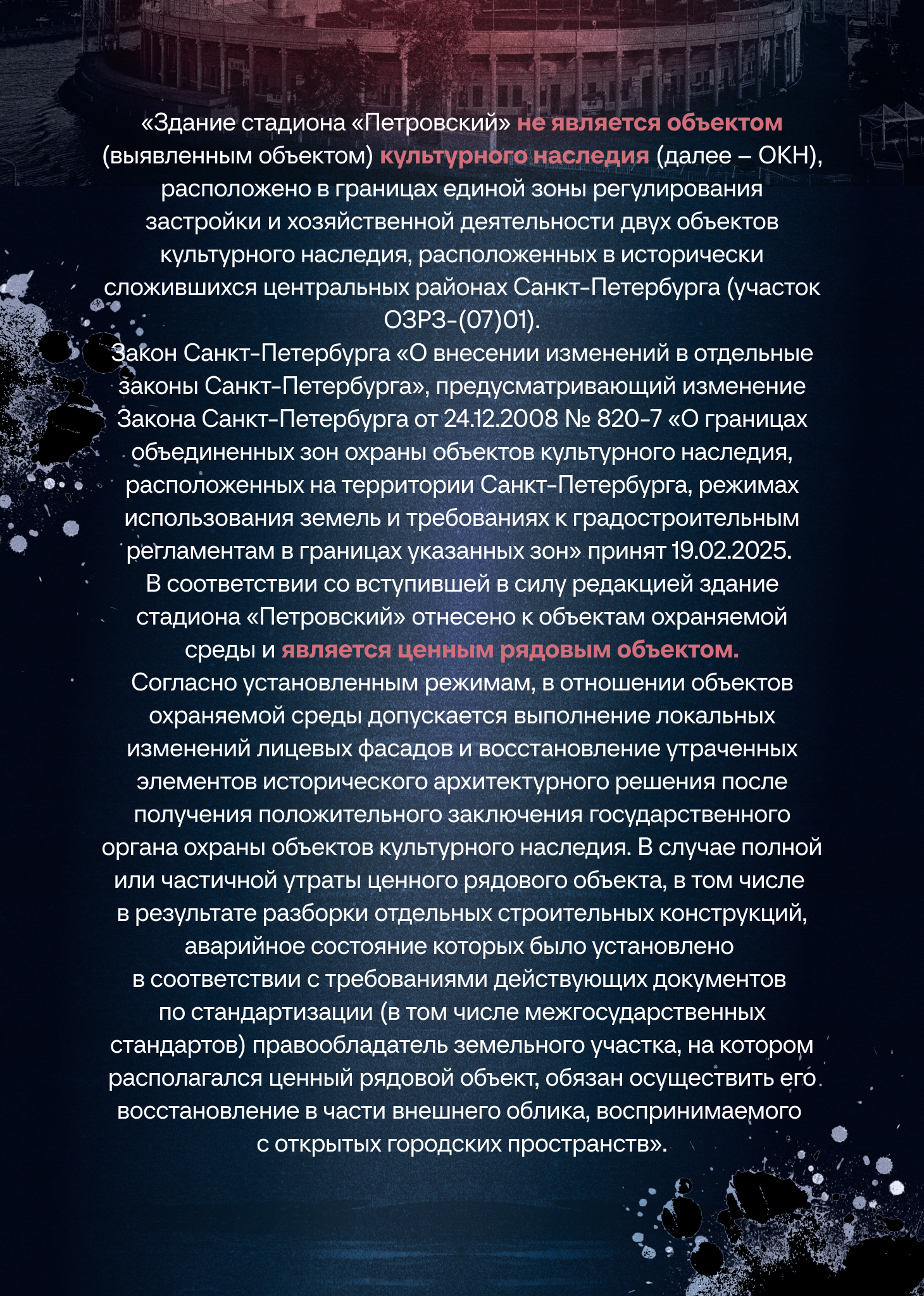 Выделим главное: теперь «Петровский» под охраной, но изменения в его внешнем облике возможны – с разрешения КГИОП. И зафиксируем: до 19 февраля 2025 года стадион городом не охранялся вообще.