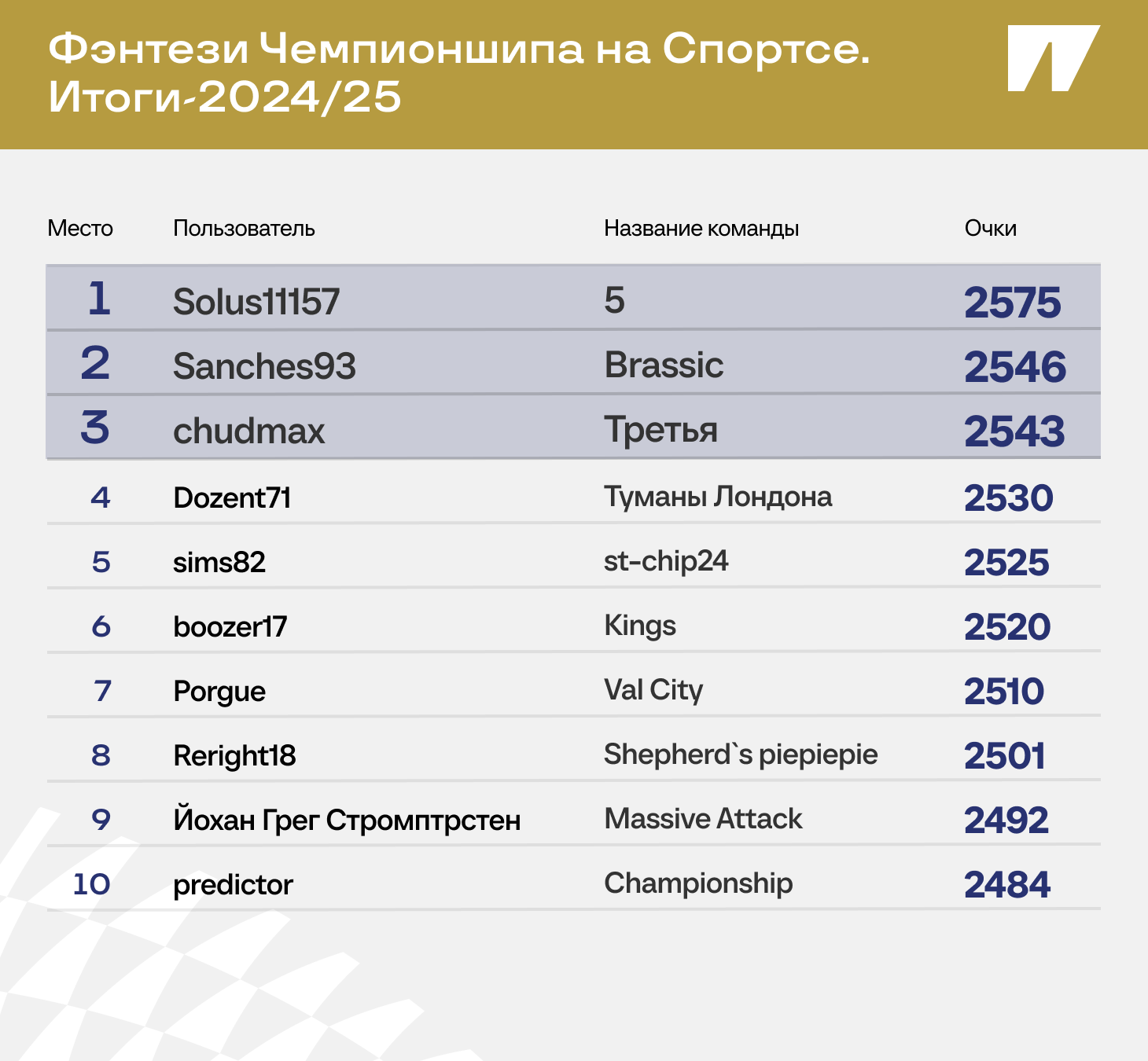 – Все, к сожалению, банально и просто: это была третья команда по счету, которую я собрал. Но в итоге очень рад, что название давало стимул оказаться в тройке. Перед последним туром цель была удержать второе место, но видимо название пересилило и привело меня на третье.