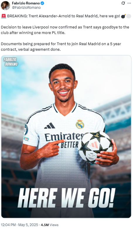 Летом Трент присоединится к «Мадриду» на правах свободного агента, передает Фабрицио Романо. Контракт, о котором уже есть устная договоренность между клубом и футболистом, подпишут на пять лет.