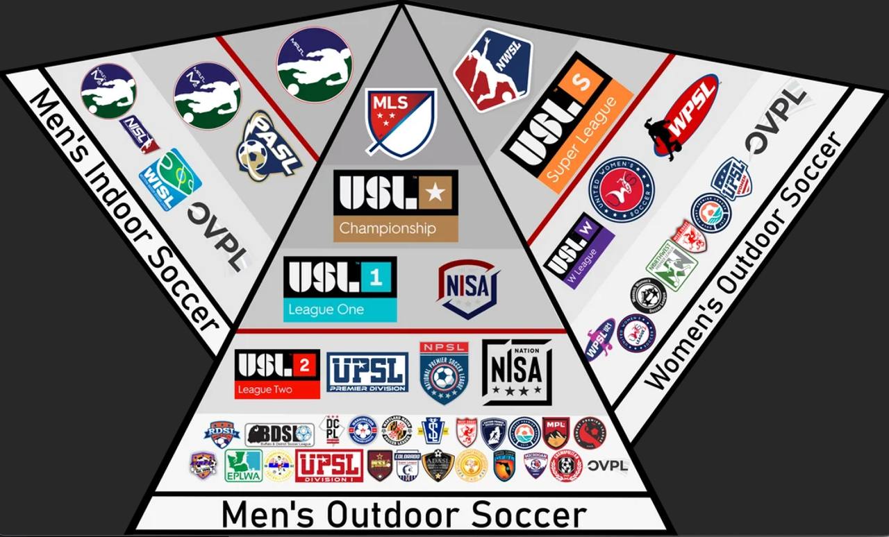 В США — десятки уровней: от профессиональной MLS до университетских чемпионатов, полупрофессиональных структур и клубов, существующих только на бумаге. Такая система кажется идеальной: хочешь играть — выбирай свою ступень и поднимайся.