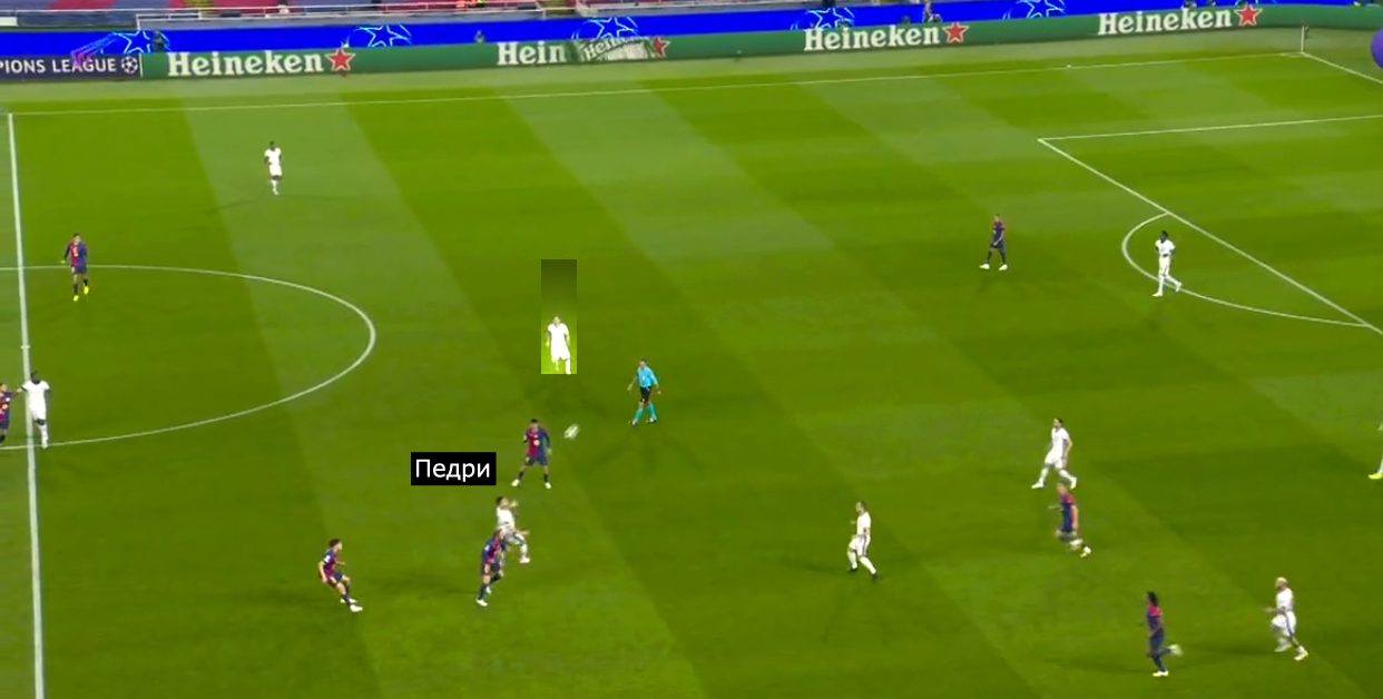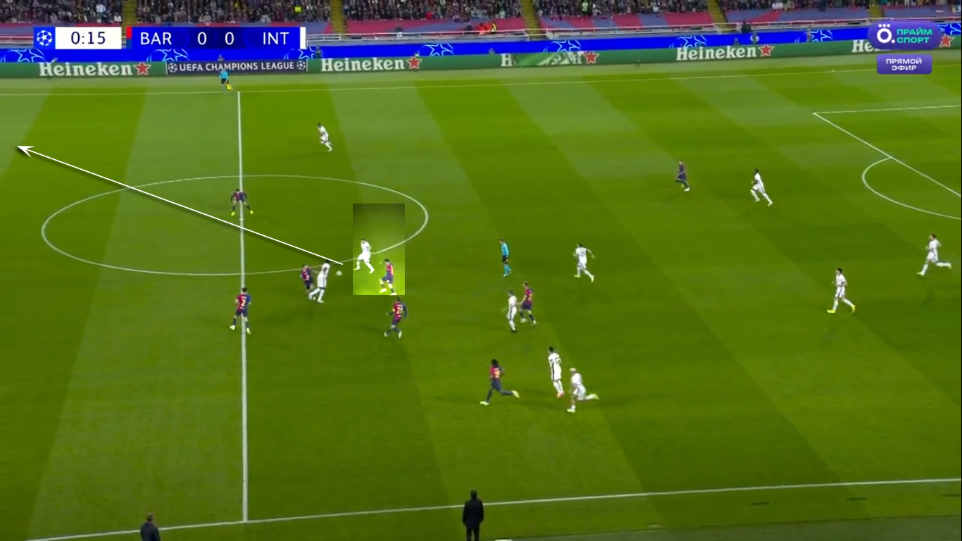 Похожие впечатления ждали «Барсу» и Педри. Первый гол «Интера» начался с очень недооцененного позиционирования Бареллы. Он разорвал дистанцию, поставив испанца в заведомо проигрышное положение. Педри привычно сузил пространство. Но если бы мяч отскочил ближе, Николо тут же атаковал на подборе. Если мяч уходил дальше, Педри оказывался догоняющим у него за спиной.