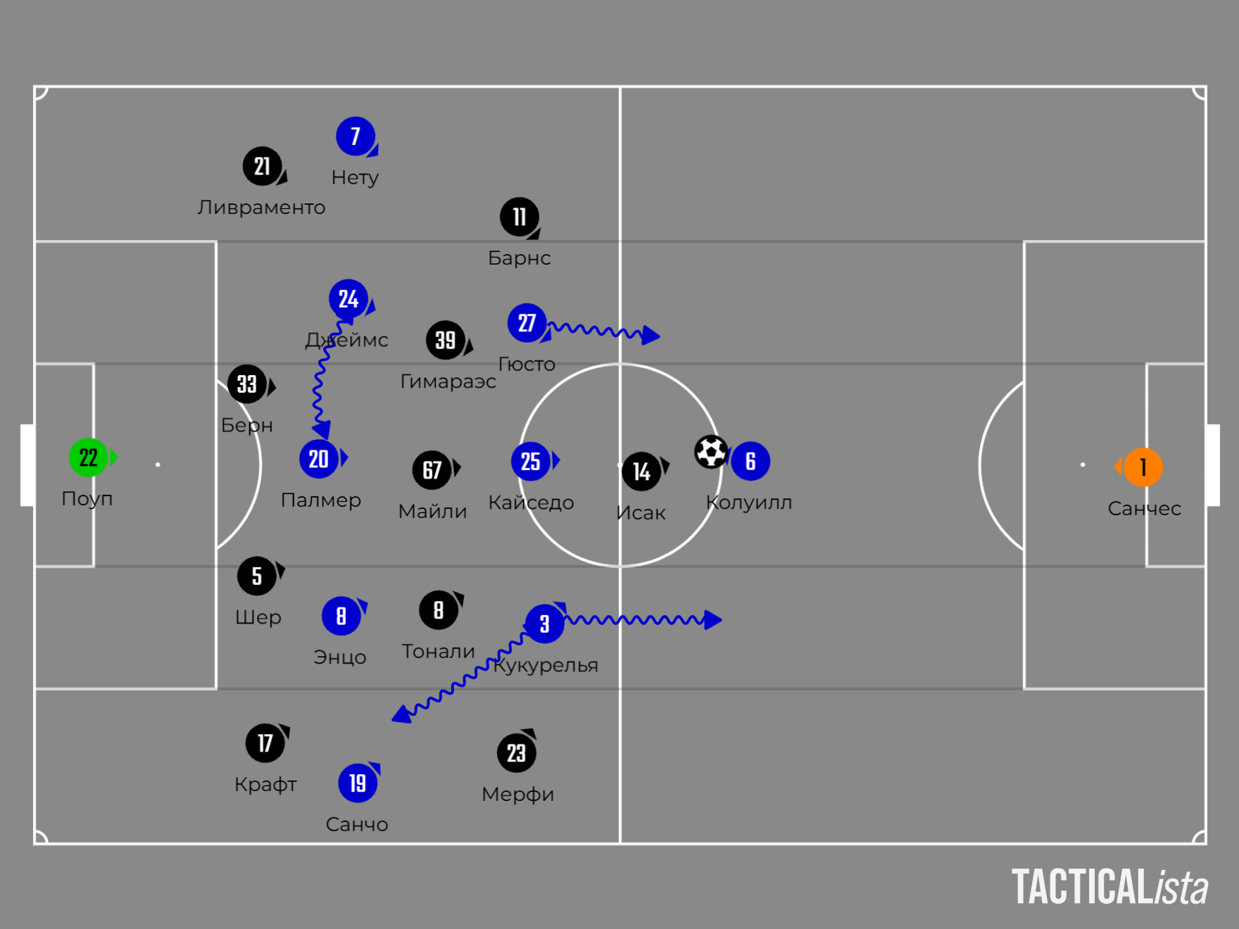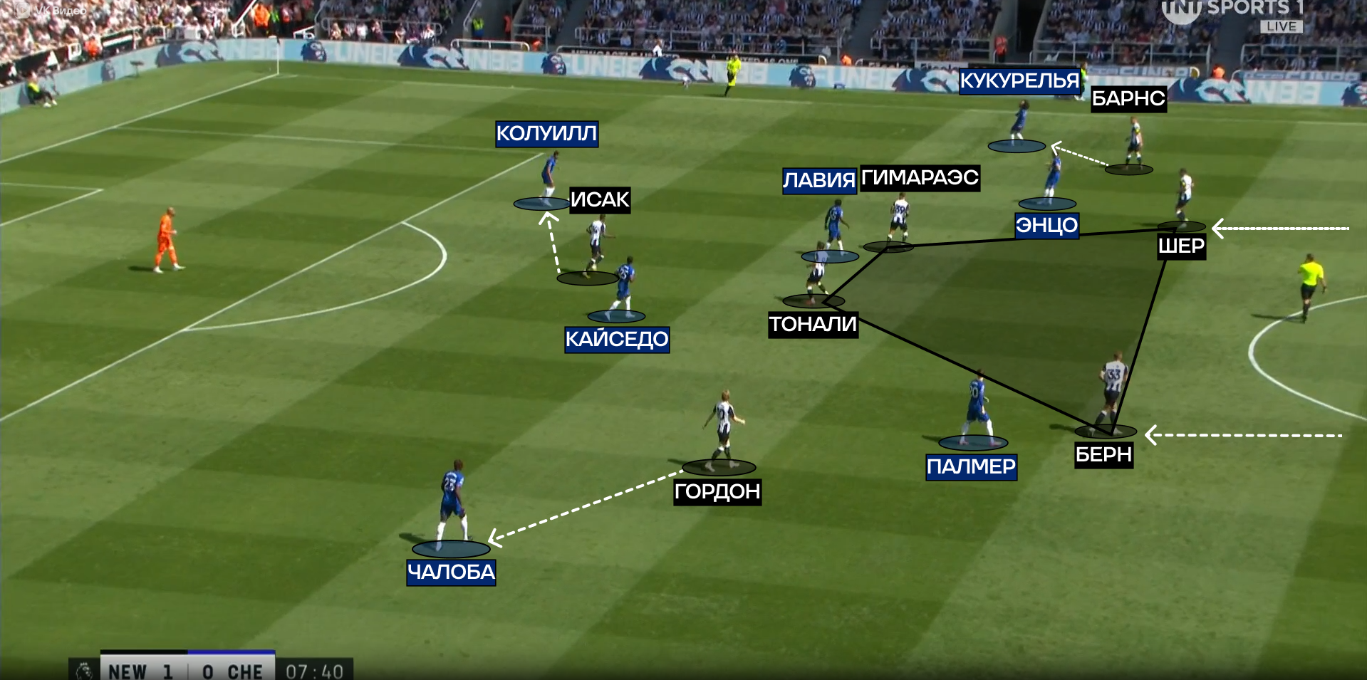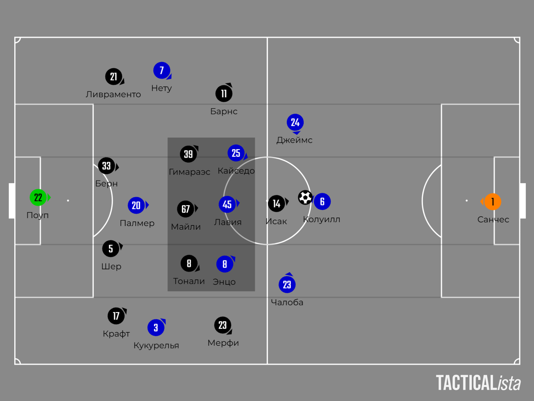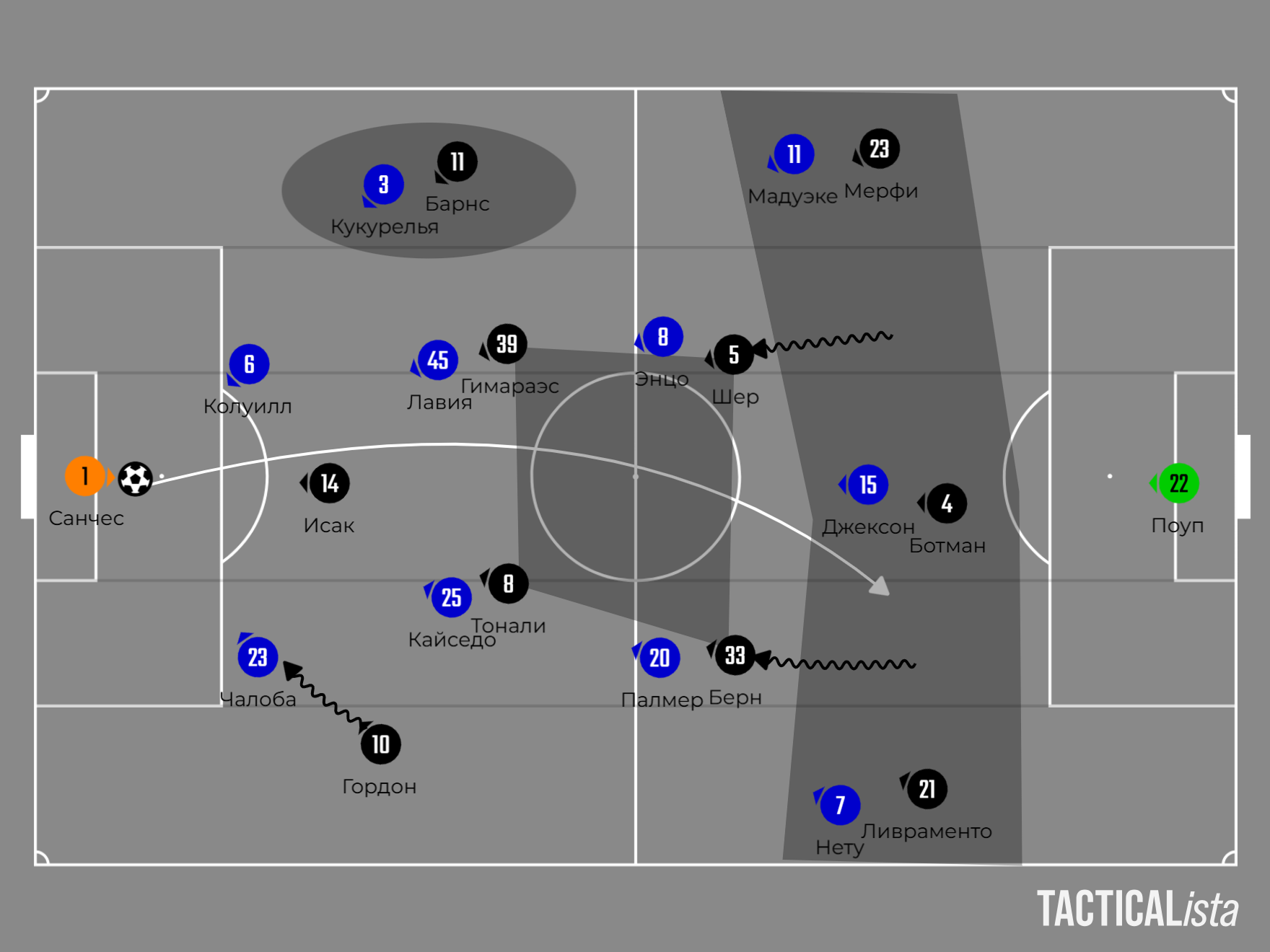 К розыгрышам мяча у «Челси», ниже часто опускаются «восьмерки» Энцо и Палмер. По ним хозяева выставили персональные маркировки в лицах Шера и Берна. Таким образом, «Ньюкасл» схватил квадрат «Челси» в центре поля, и, помимо этого, не давал разыграть мяч через фланги.
