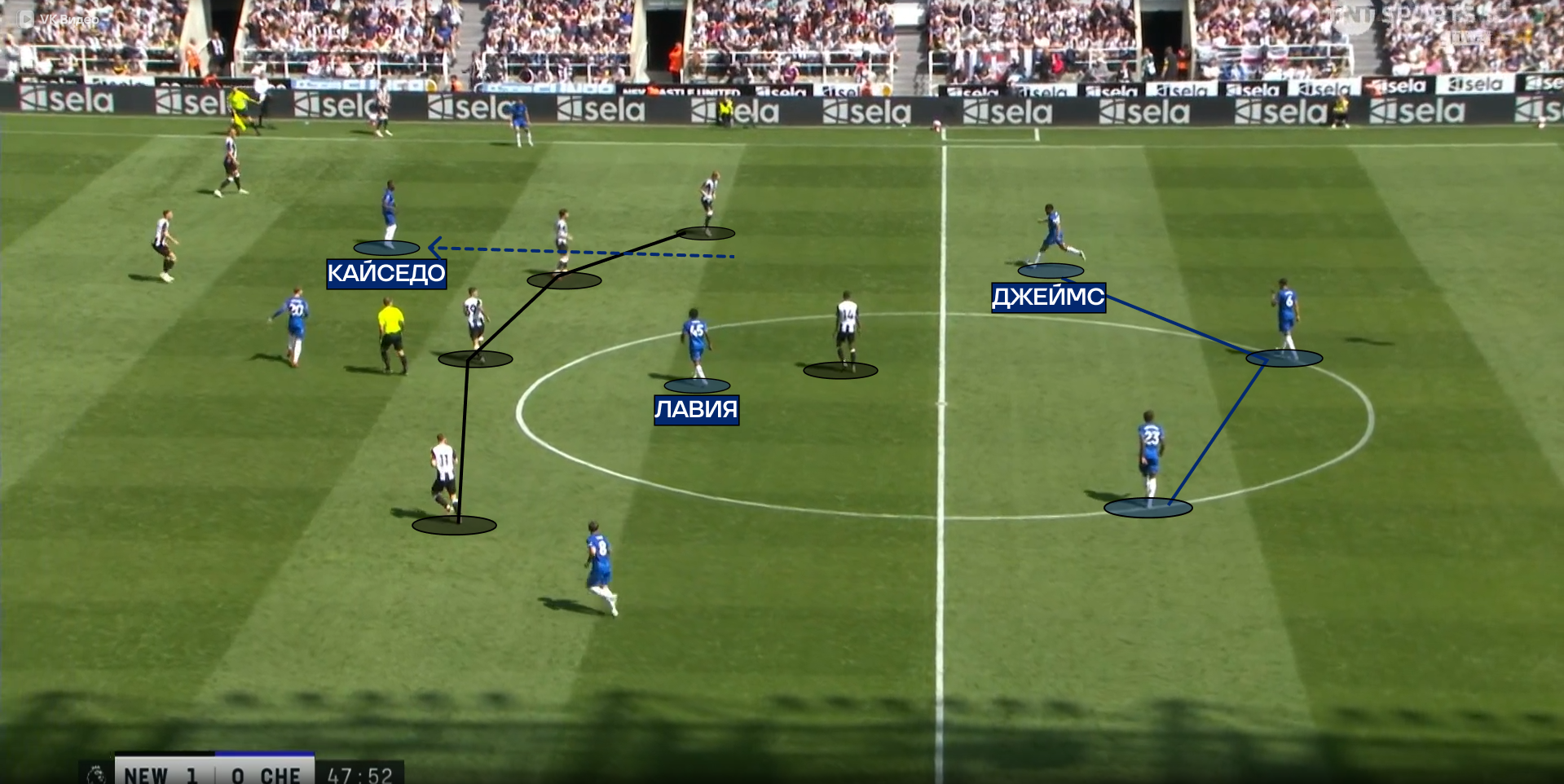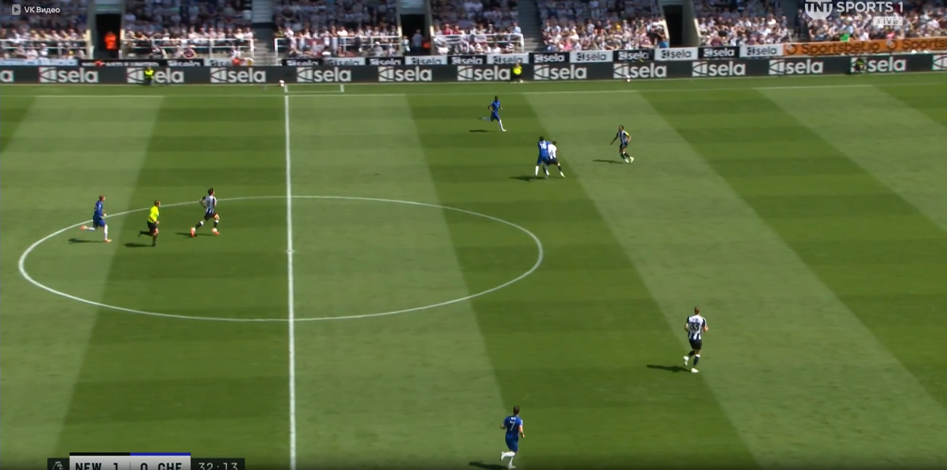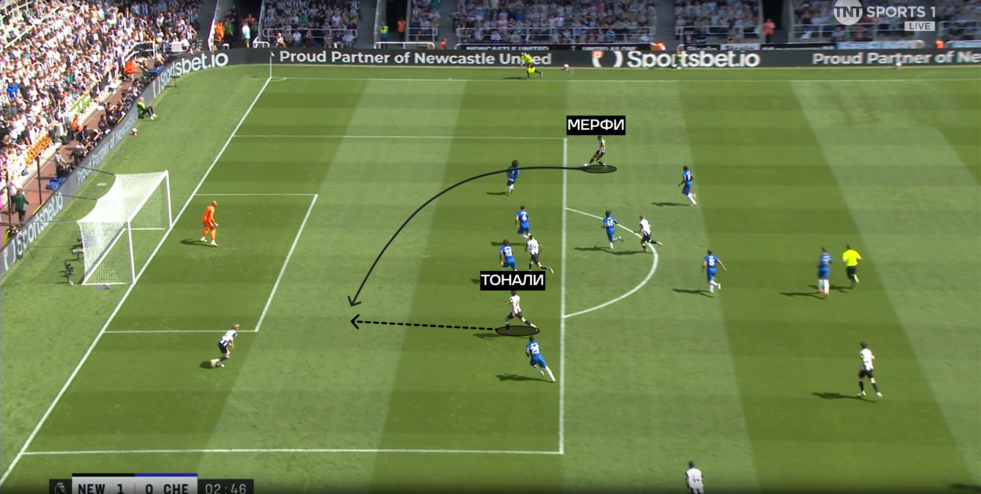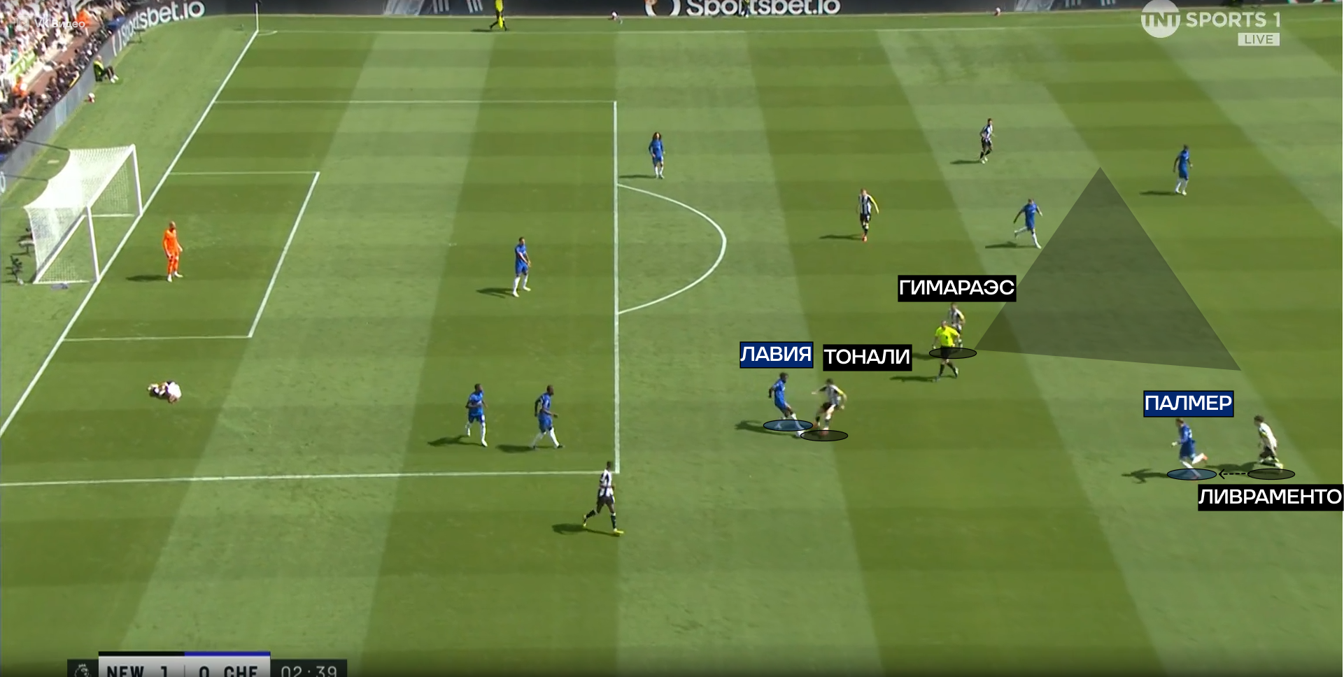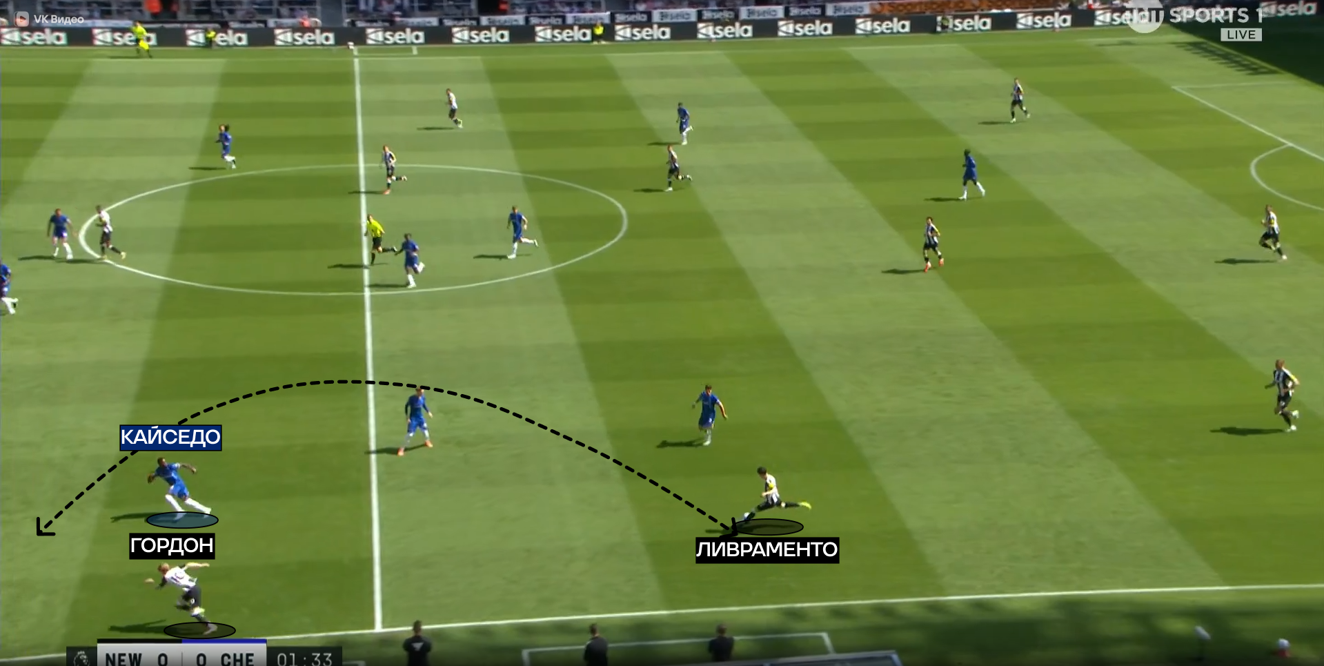 К розыгрышам мяча у «Челси», ниже часто опускаются «восьмерки» Энцо и Палмер. По ним хозяева выставили персональные маркировки в лицах Шера и Берна. Таким образом, «Ньюкасл» схватил квадрат «Челси» в центре поля, и, помимо этого, не давал разыграть мяч через фланги.