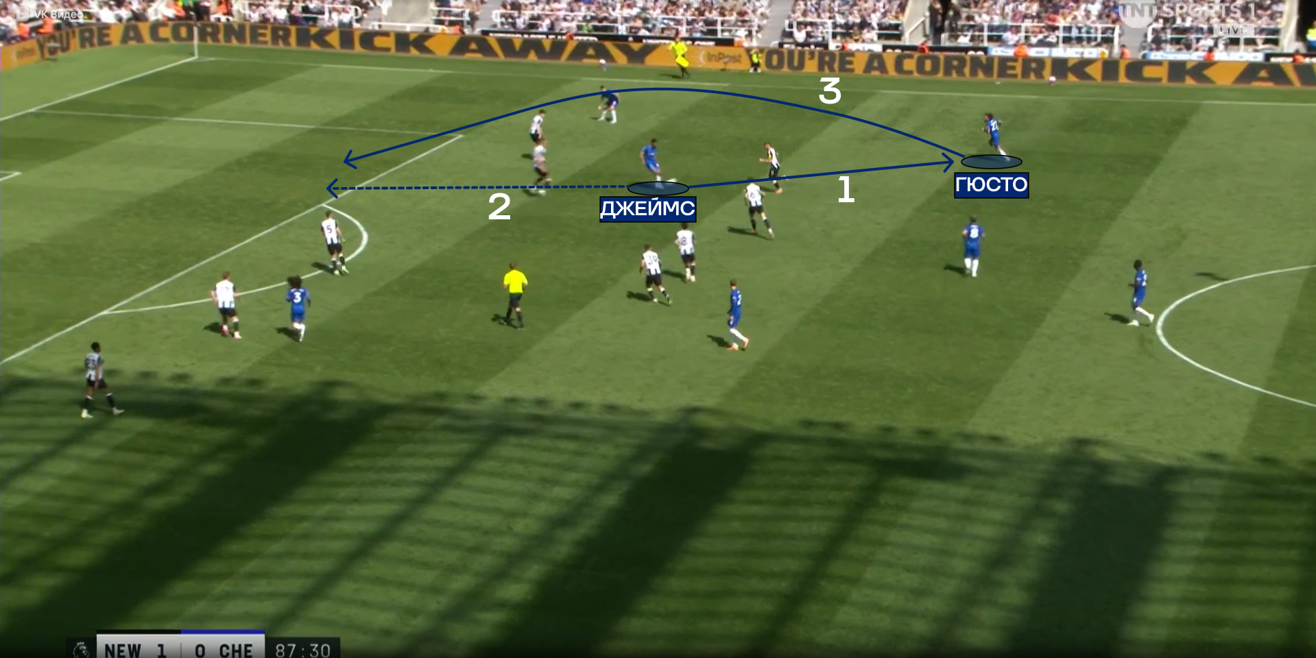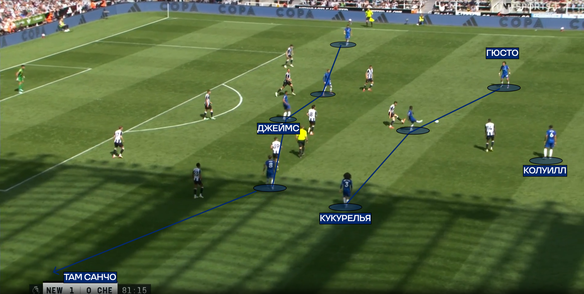 Ключевым и успешным эпизодом мог стать момент на 88-й минуте. Рис Джеймс принимает мяч как раз в позиции на правом полуфланге, скидывая мяч на Гюсто. Далее, англичанин делает рывок в свободную зону, куда Мало и подает. Увы, Рис не забивает, но эпизод становится главным моментом «синих» в финальном штурме ворот хозяев.