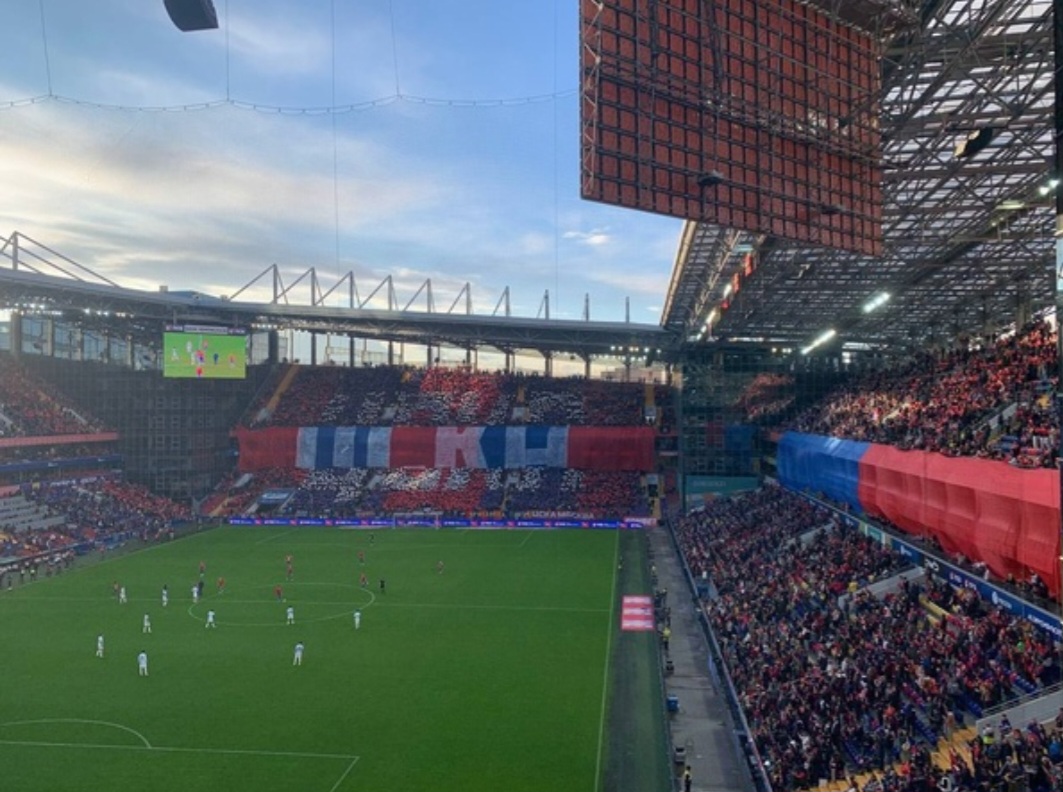 Первый перфоманс был из плашек. На трёх трибунах были разложены красно - синие плашки. На трибуне А - фанатской, из плашек выложили надпись ЦСКА. ( получилось не очень)