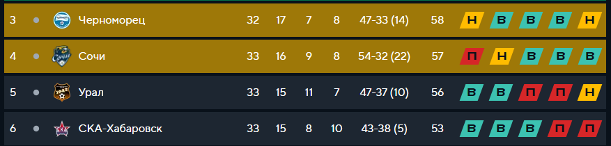 Напоминаем, что у «Урала» лучше по личкам и с теми, и с другими. И потенциальные 59 очков могут стать «бронзовыми». А значит стыки, неважно с кем, «Ахмат» там, Нижний или даже Махачкала. Просто обыграйте Хабаровск и неважно что там случится на берегу Черного моря.