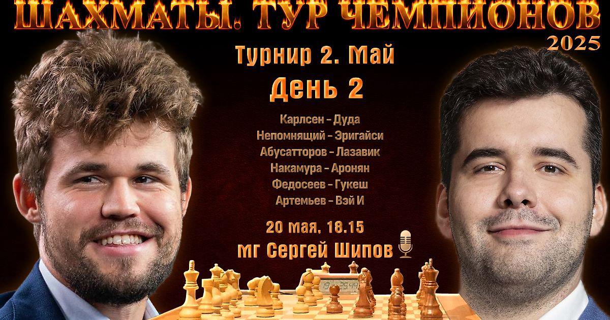 Карлсен, Непомнящий, Артемьев, Накамура 🏆 Тур чемпионов. День 2 ⏰ 20 мая, 18.15 🎤 Сергей Шипов ♕ Шахматы