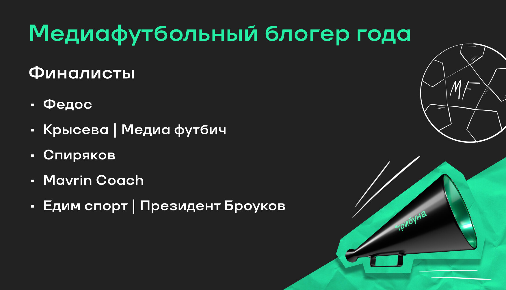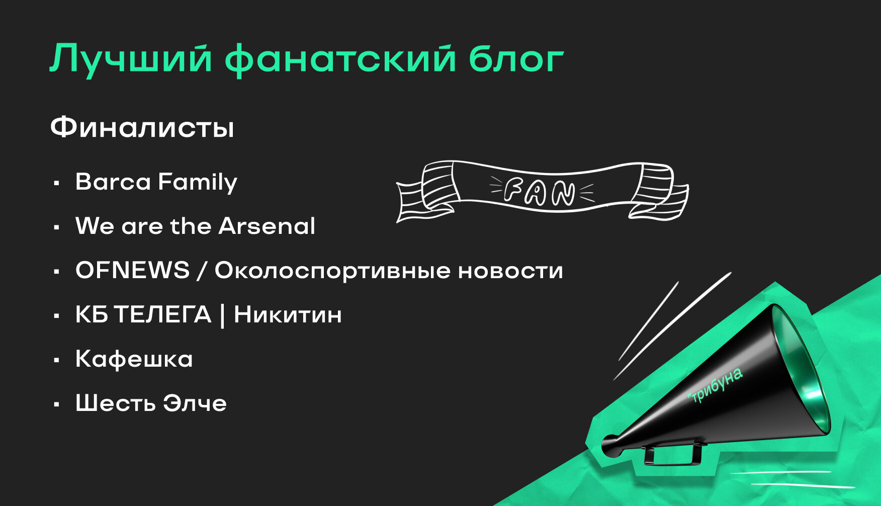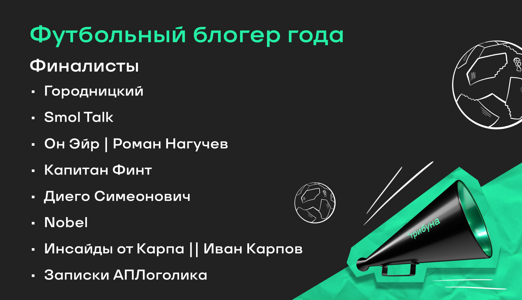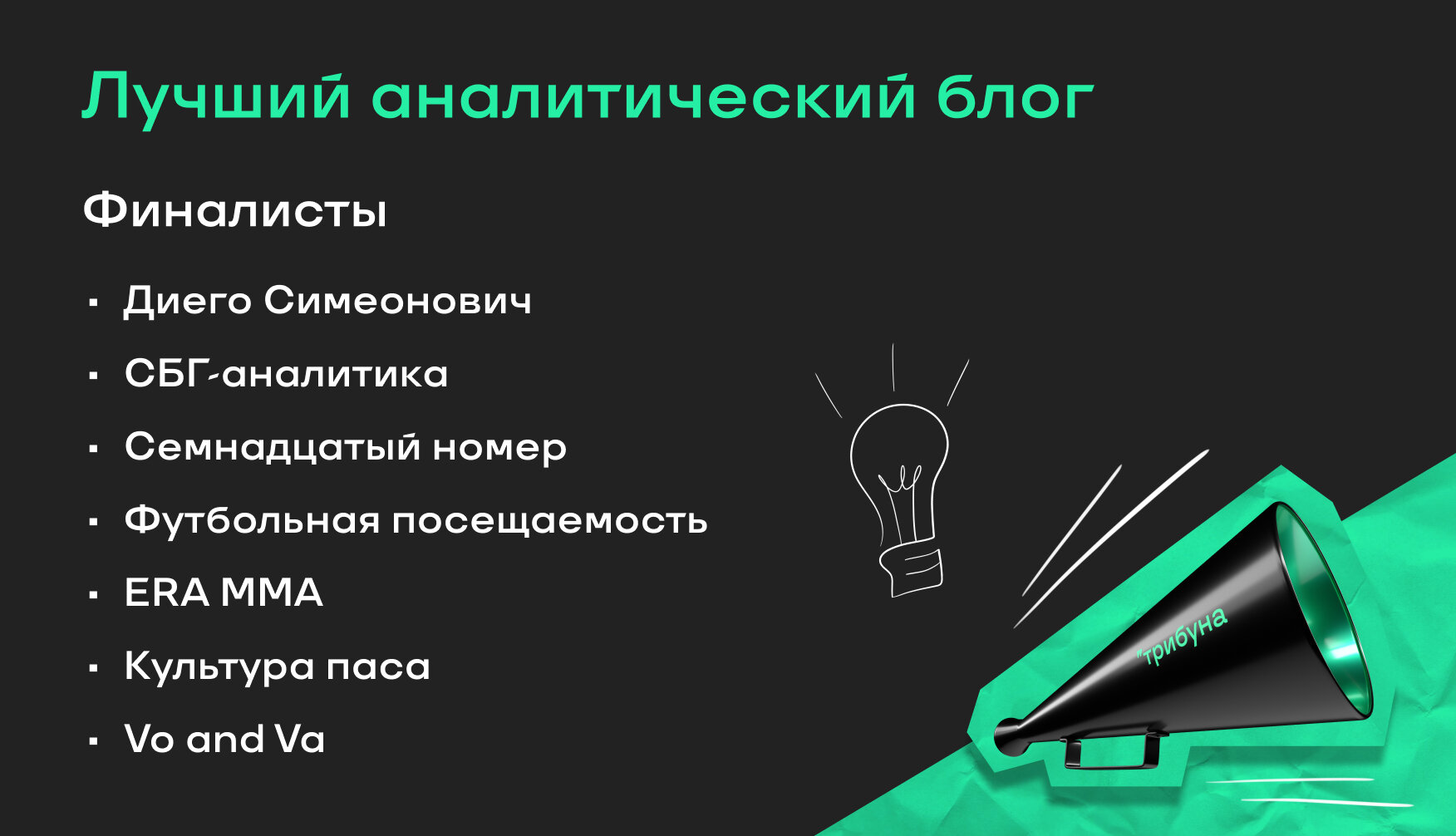 Кирилл Хаит (это его вторая номинация!) – о европейском футболе, СБГ-аналитика – о «Зените», Валерий Полевиков – с эмоциональной окраской, Станислав Чудин – со стадионов российских футбольных клубов, ERA MMA – боев, «Культура паса» – о передачах, конечно.