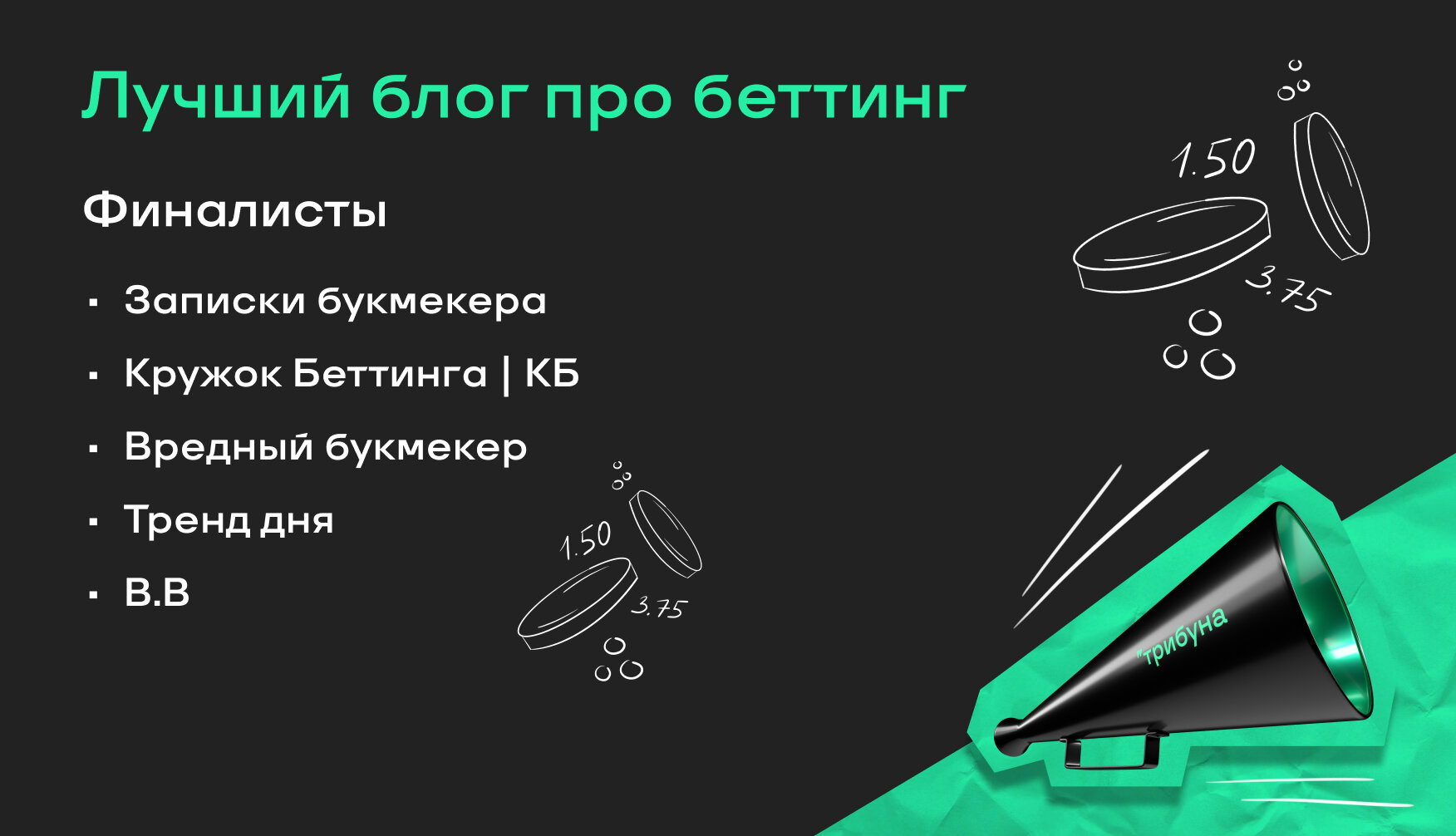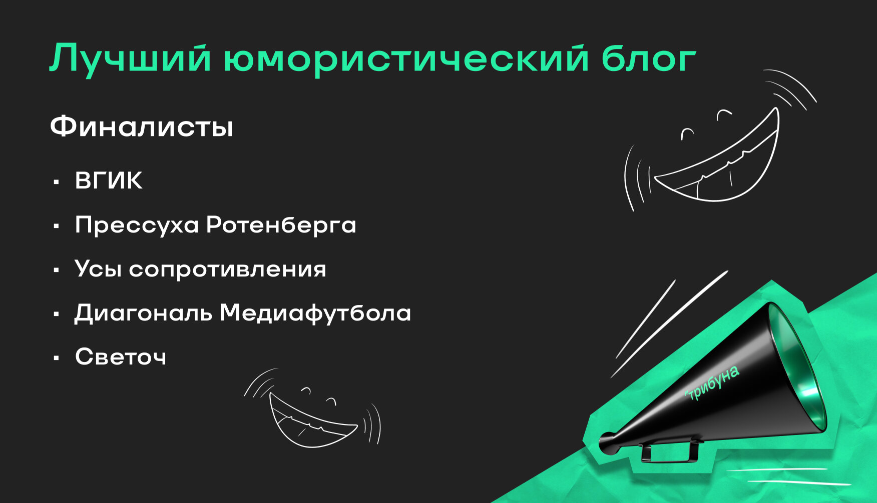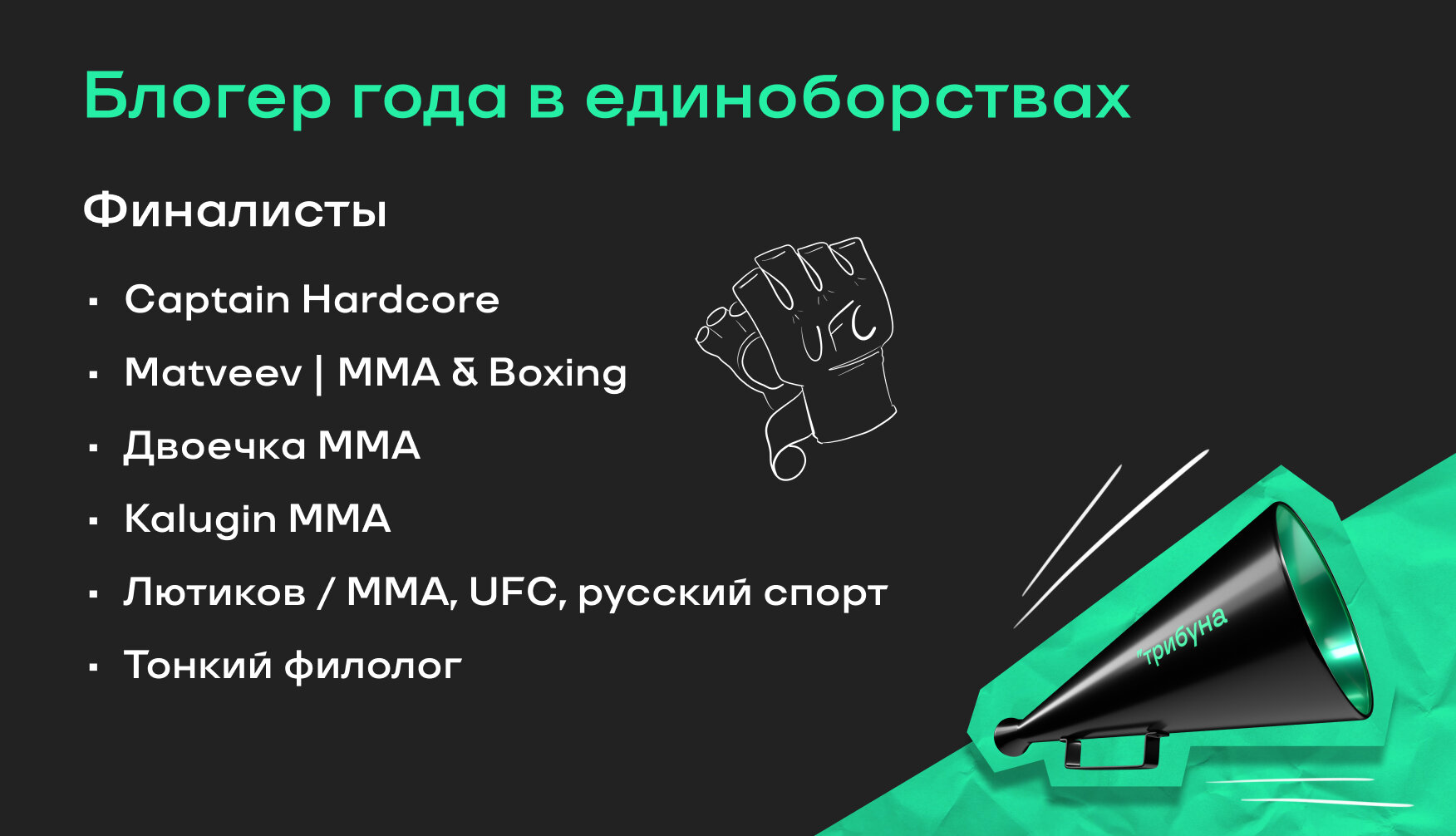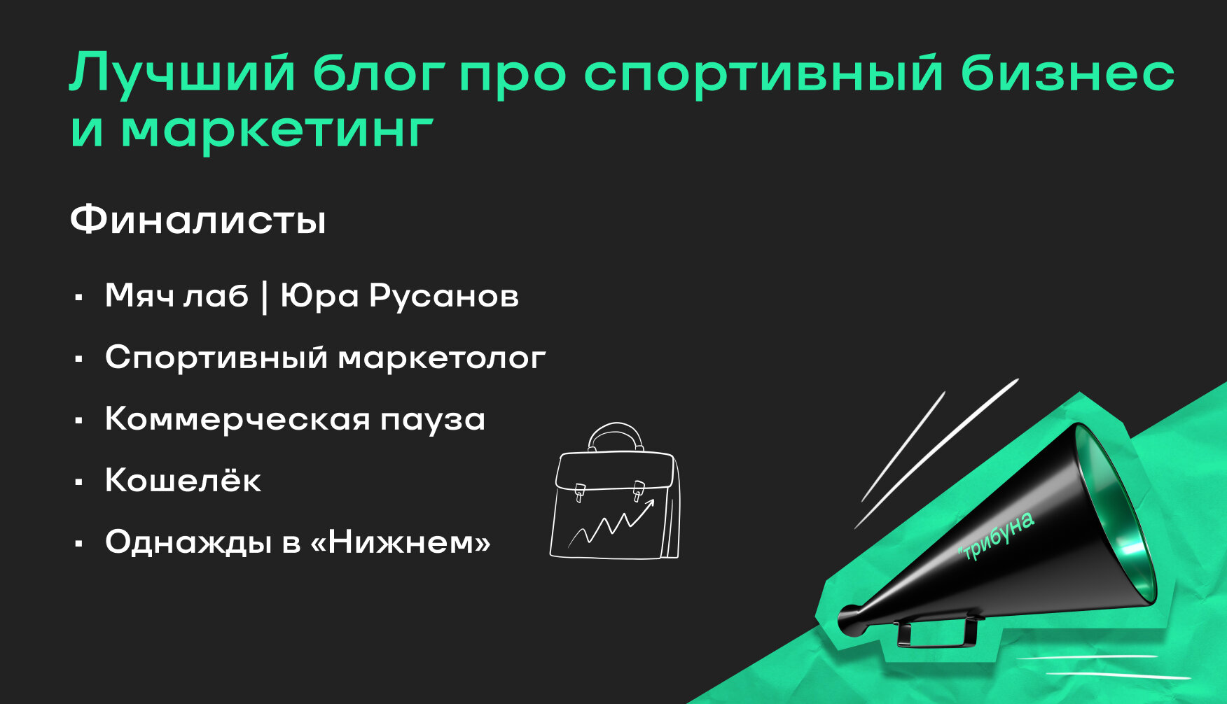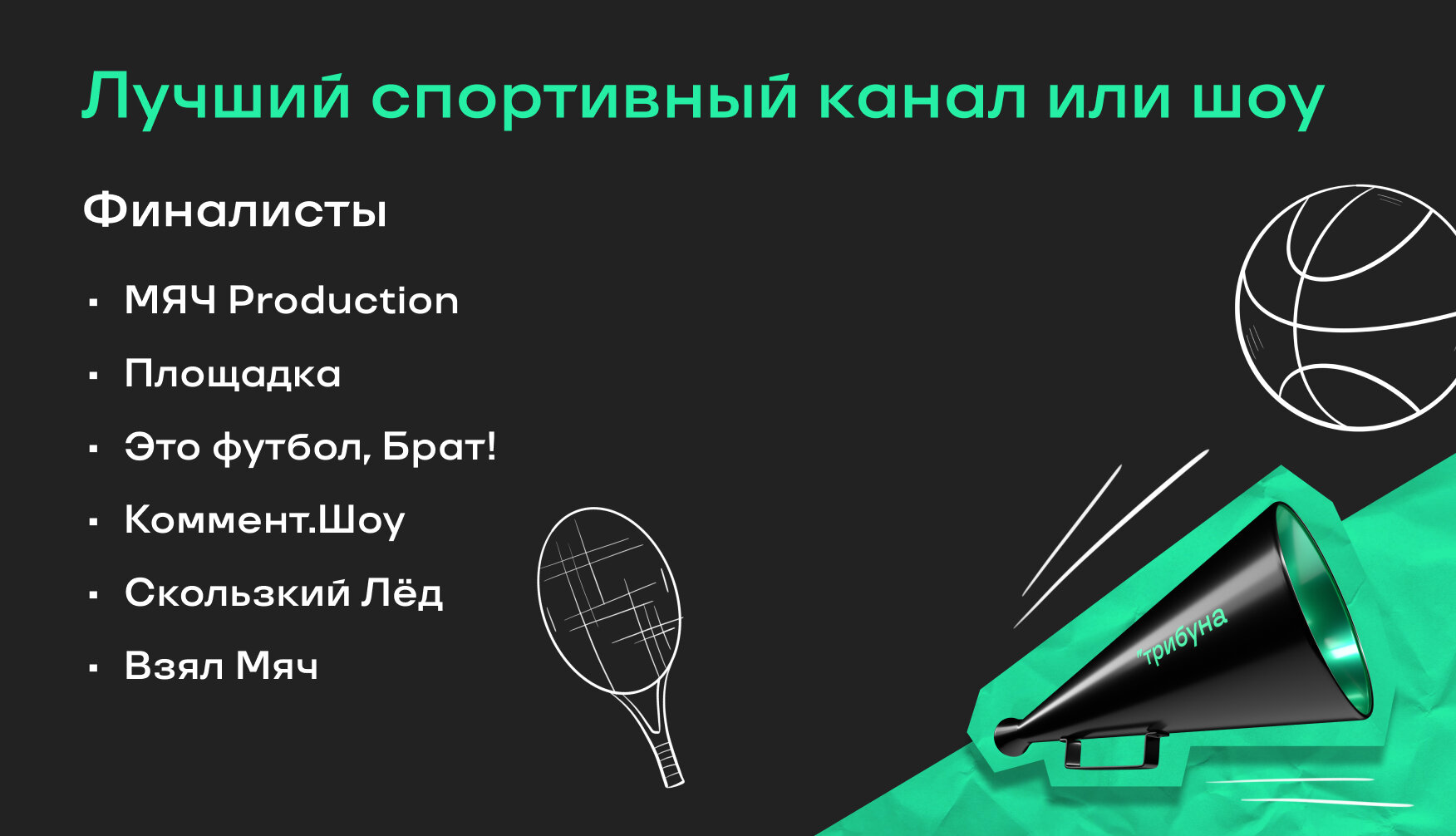 Кирилл Хаит (это его вторая номинация!) – о европейском футболе, СБГ-аналитика – о «Зените», Валерий Полевиков – с эмоциональной окраской, Станислав Чудин – со стадионов российских футбольных клубов, ERA MMA – боев, «Культура паса» – о передачах, конечно.