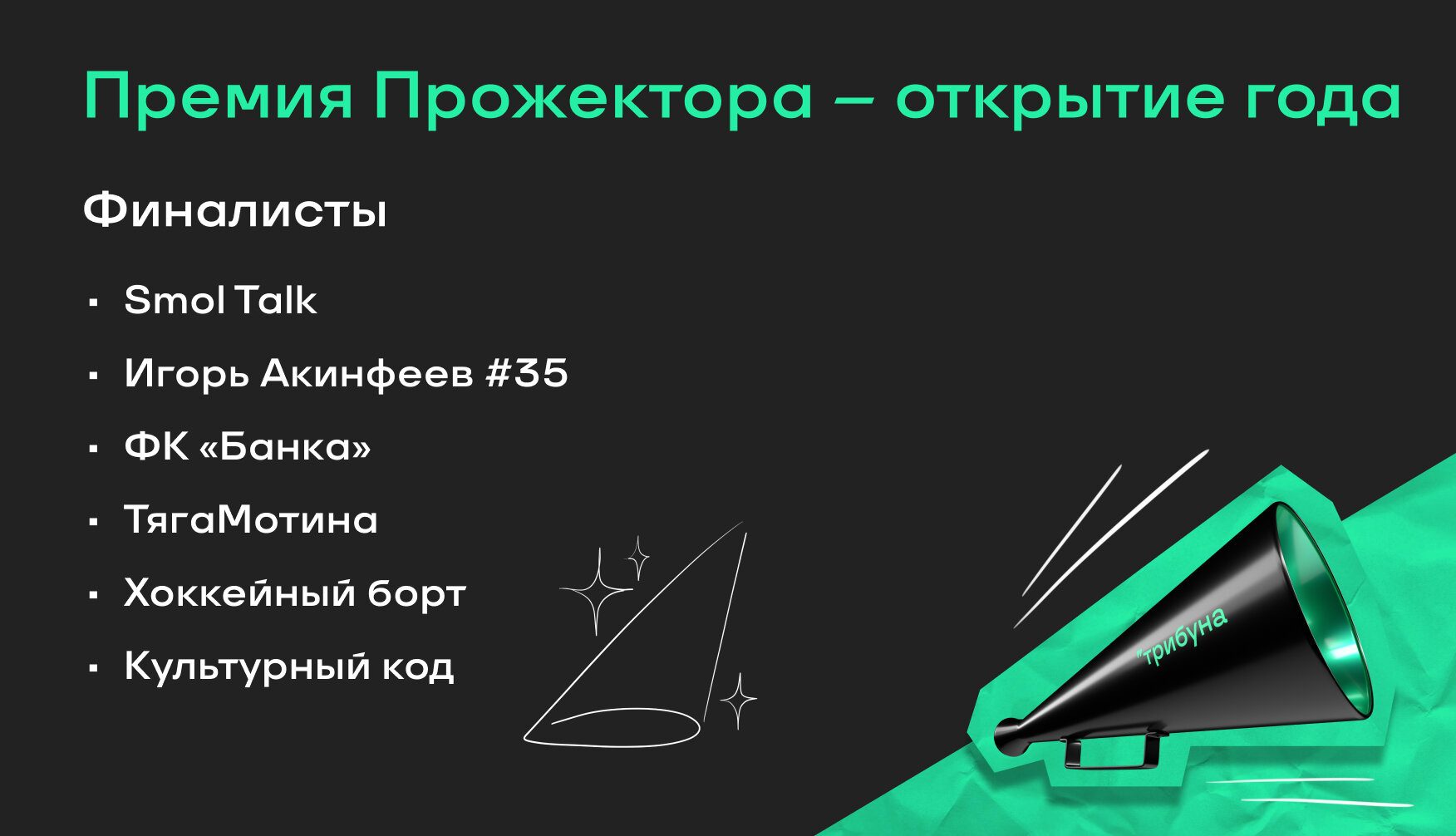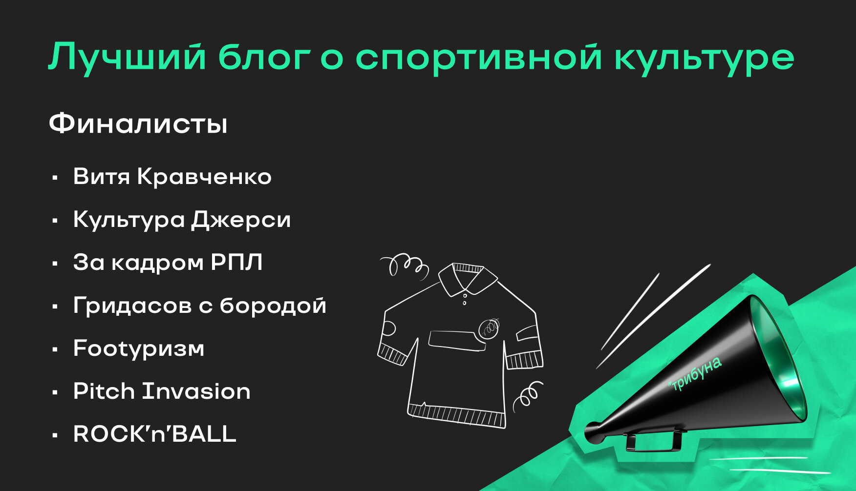 Независимая журналистика Вити Кравченко, стиль «Культуры Джерси», шутки «За кадром РПЛ», история Станислава Гридасова, путешествия Даниса Мустафина, вайб Pitch Invasion и легендарные истории от ROCK’n’BALL. Не позавидуешь экспертам. Выбирать просто невозможно!