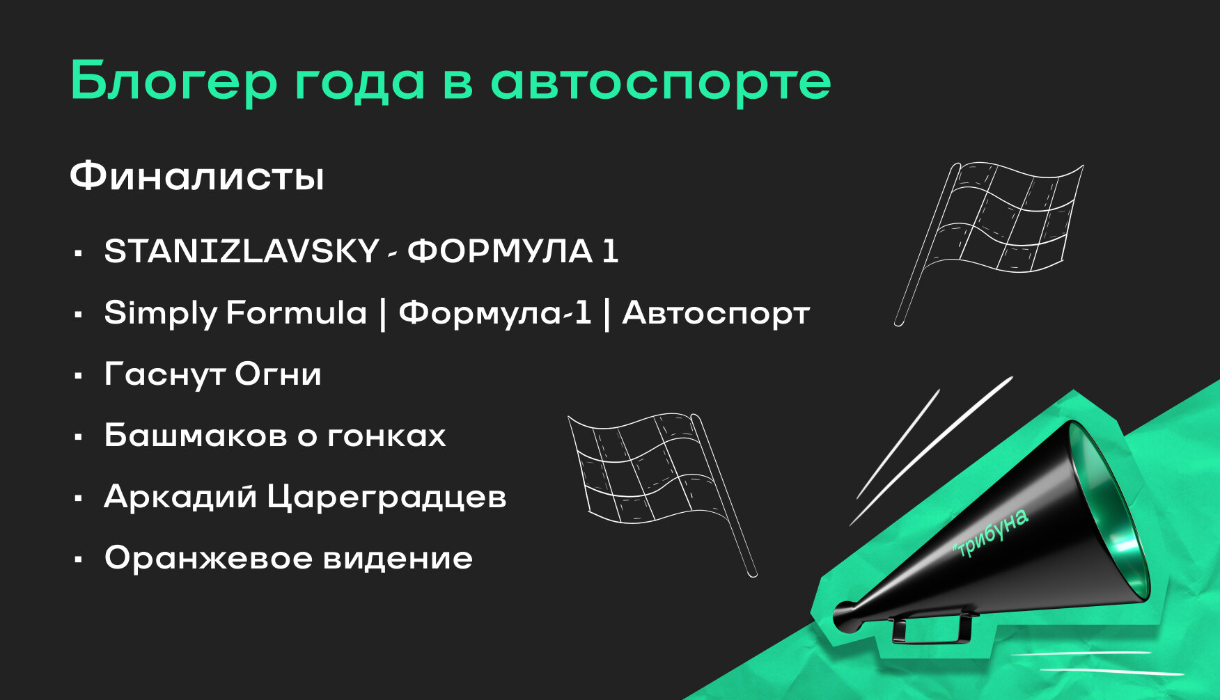 Это не просто премия для блогеров Трибуны, а самое масштабное голосование за самые громкие голоса российского спортивного интернета на любой площадке в 23 номинациях: от лучших по видам спорта (футбол, хоккей, баскетбол, автоспорт, единоборства, летние и зимние виды) до чемпионов в отдельных жанрах: например, юмористический, аналитический или фанатский блог или клубный влог.