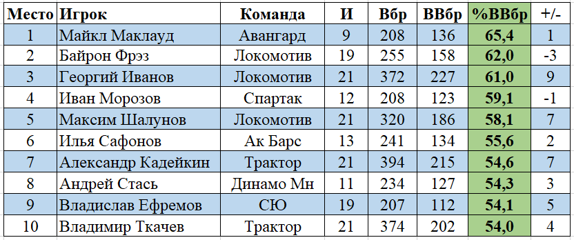 Как видно по проценту выигранных вбрасываний в первой пятерке находится 3 игрока «Локомотива», ярославцы доминировали на точке как в регулярном сезоне, так и в плей-офф. Это стало очень важным фактором для них на пути к чемпионству.
