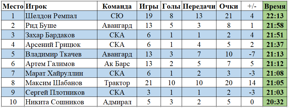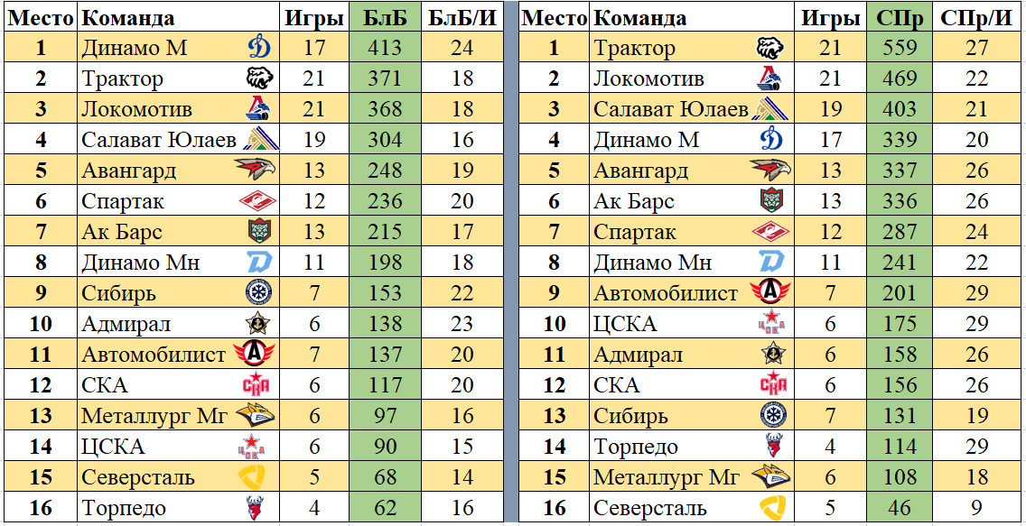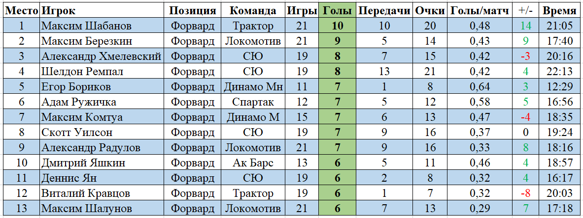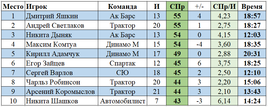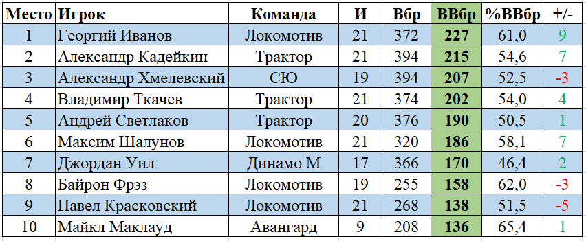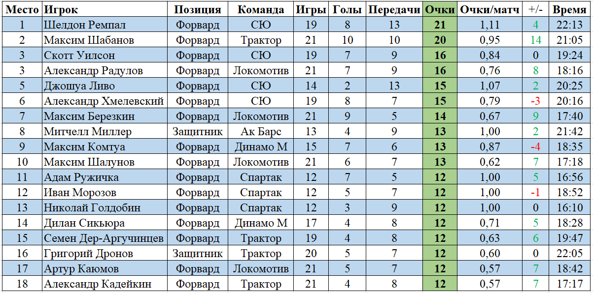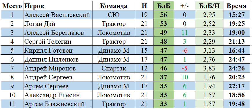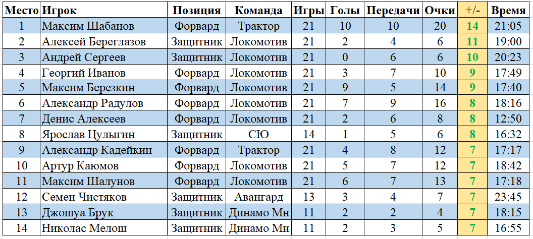 Лучшим по показателю полезности стал Максим Шабанов, у которого «+14» за 21 матч. Дальше идет 6 (!) игроков «Локомотива», среди которых лидерами являются 2 защитника Алексей Береглазов (+11) и Андрей Сергеев (+10).