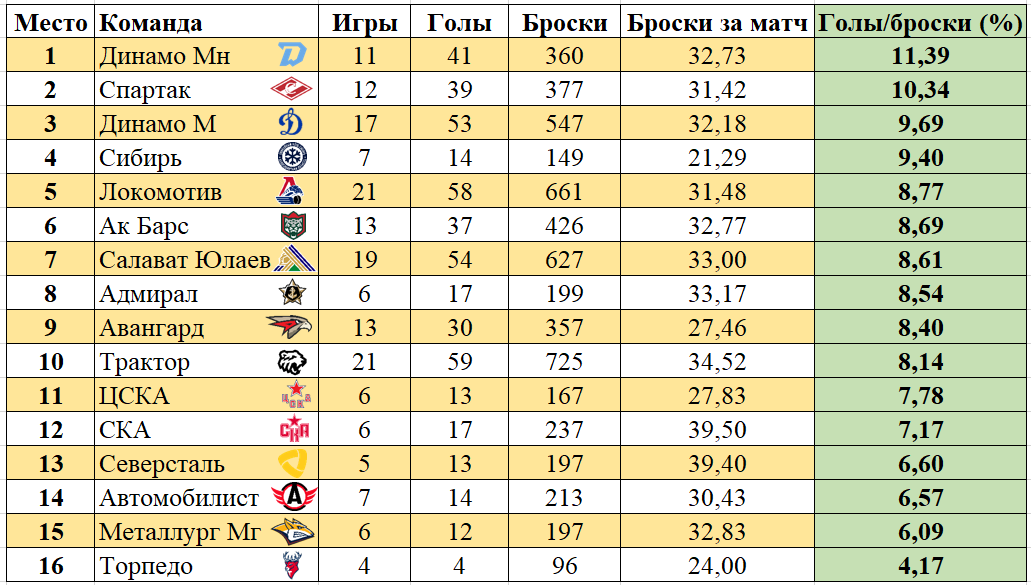 Наименьшее количество бросков в среднем за матч у «Сибири» – всего 21.29. Еще у трех команд в среднем менее 30 бросков за матч: «Торпедо» (24.00), «Авангард» (27.46) и «ЦСКА» (27.83).