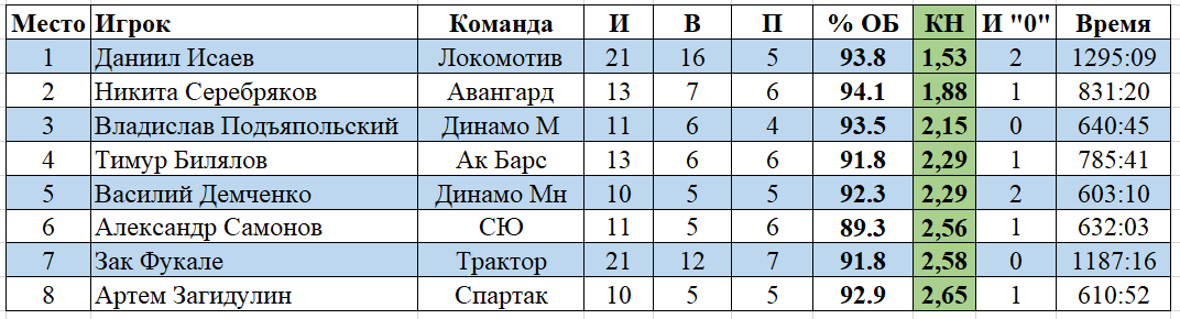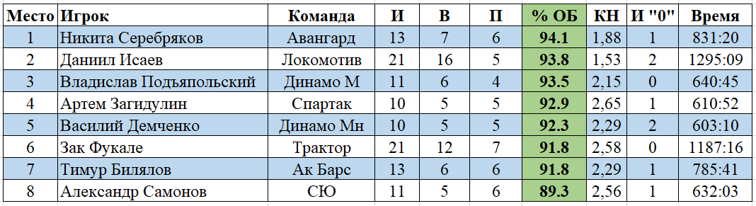 По проценту отраженных бросков лучшим вратарем Кубка Гагарина стал Никита Серебряков с отличным показателем – 94.1 %. Второе место у чемпиона Даниила Исаева – 93.8%. Третьим стал вратарь московского «Динамо» Владислав Подъяпольский – 93.5%. Отмечу, что в таблице представлены вратари, которые сыграли минимум 10 матчей в плей-офф.