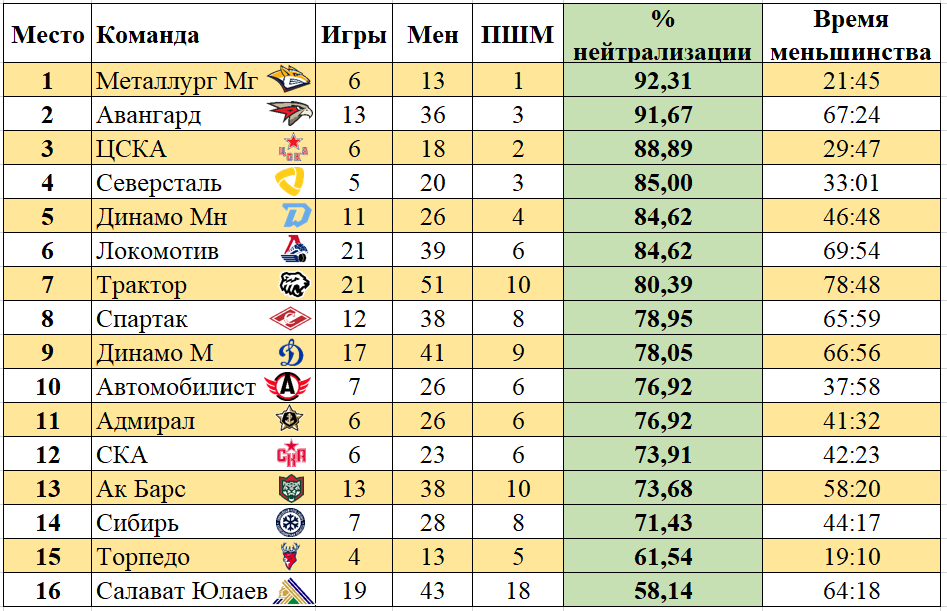 Худшими по нейтрализации большинства стали игроки «Салавата Юлаева», уфимская команда пропустила 18 голов на 43 попытки (58.14 %).
