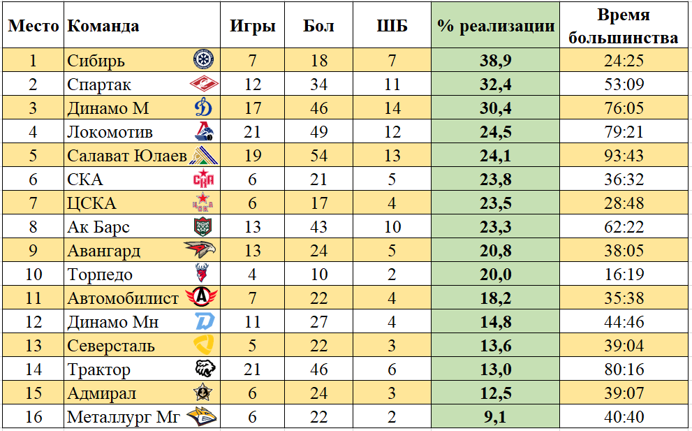 По абсолютным показателям лучшими стали игроки московского «Динамо», они забросили 14 шайб в большинстве. Далее расположились «Салават Юлаев» (13 шайб), «Локомотив» (12), «Спартак» (11) и «Ак Барс» (10).