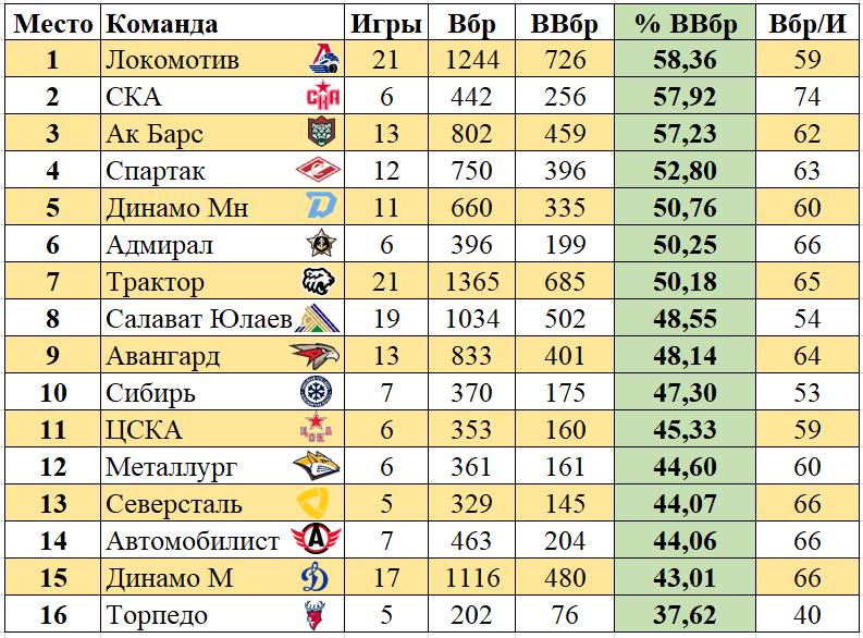 У 7 команд процент выигранных вбрасываний больше 50%. Худшей командой стали игроки «Торпедо» (37.62 %), которые, собственно, сыграли всего 4 матча против лидера по рассматриваемому показателю – «Локомотива».